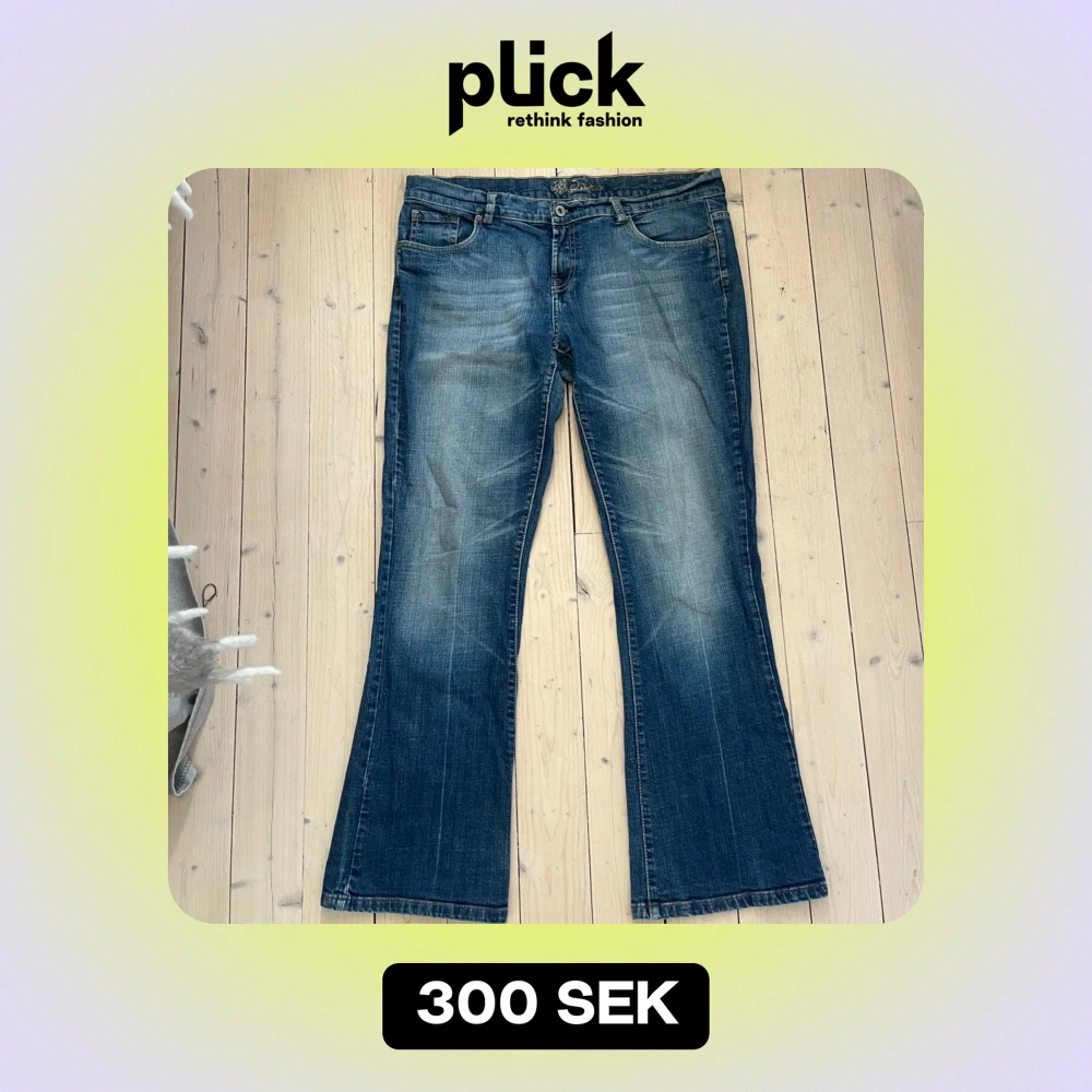 Säljer ett par snygga blå bootcut jeans. De har en fin tvättad look och broderade detaljer på bakfickorna. Midjemått: 48cm Innerbenslängd: 73cm Skriv om du undrar något! Skulle tippa storleken runt S/M