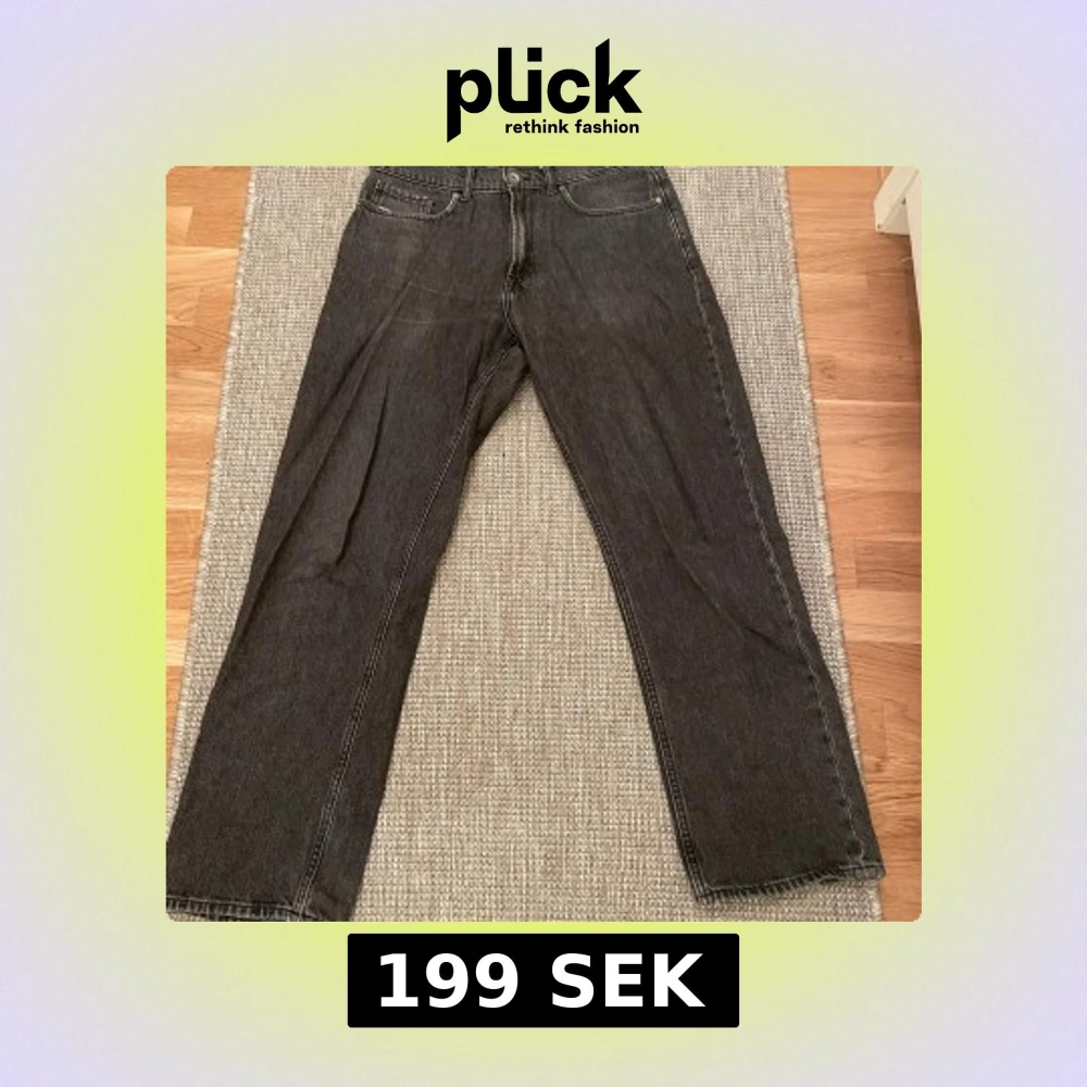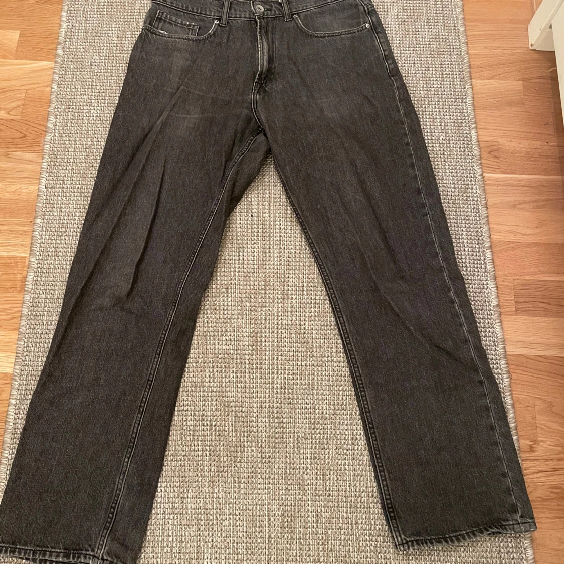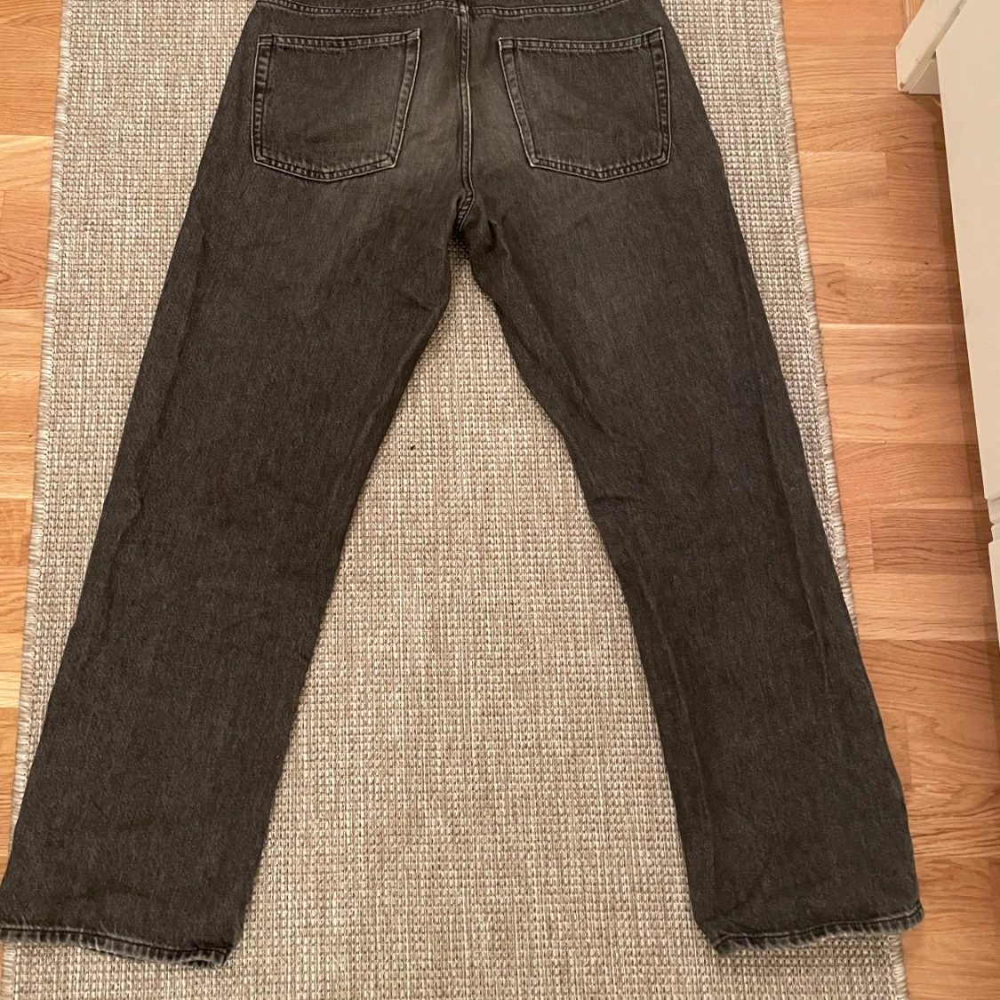 Säljer ett par svarta jeans med rak passform och klassisk femficksdesign. Jeansen har normal midja och är tillverkade i ett tåligt denimtyg. Perfekta för dig som gillar en enkel och stilren look.