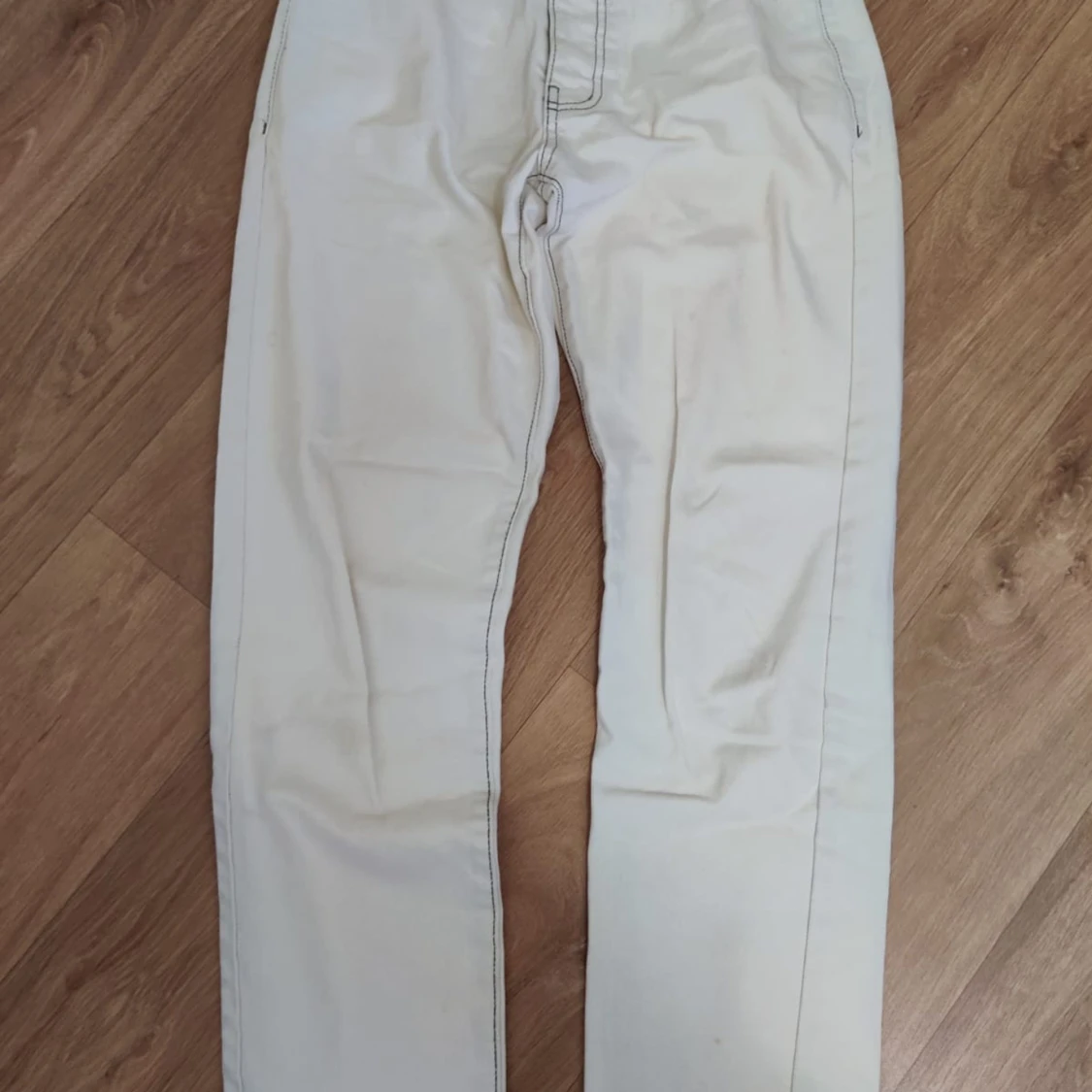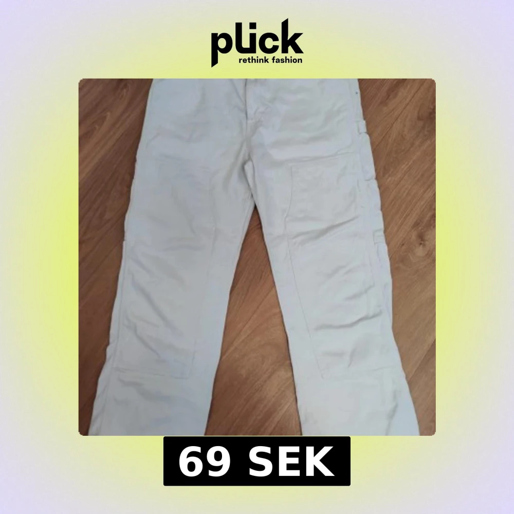 Säljer ett par vita cargopants med raka ben och stora sidofickor. Byxorna har en clean look och är perfekta för dig som gillar streetstyle. Materialet känns som bomull och de har en avslappnad passform. Passar dig som vill ha en enkel men snygg stil.