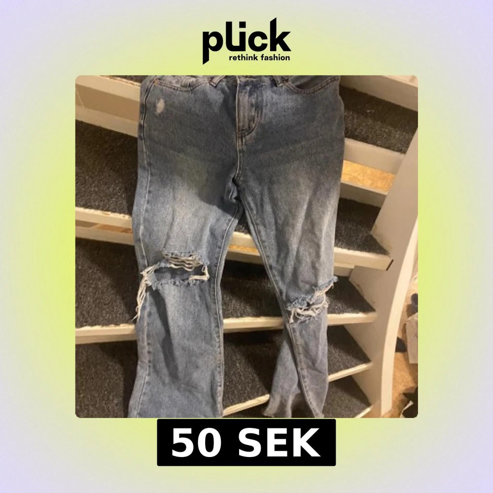 Säljer ett par blå jeans med coola slitningar och stora hål på båda knäna. De har en klassisk femficksdesign och bootcut.