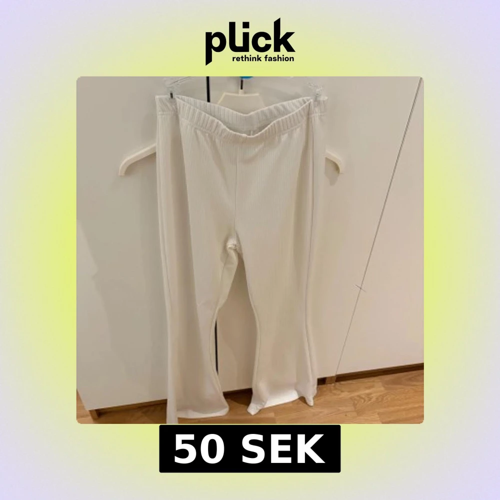 Säljer ett par vita utsvängda byxor med ribbad struktur och elastisk midja.