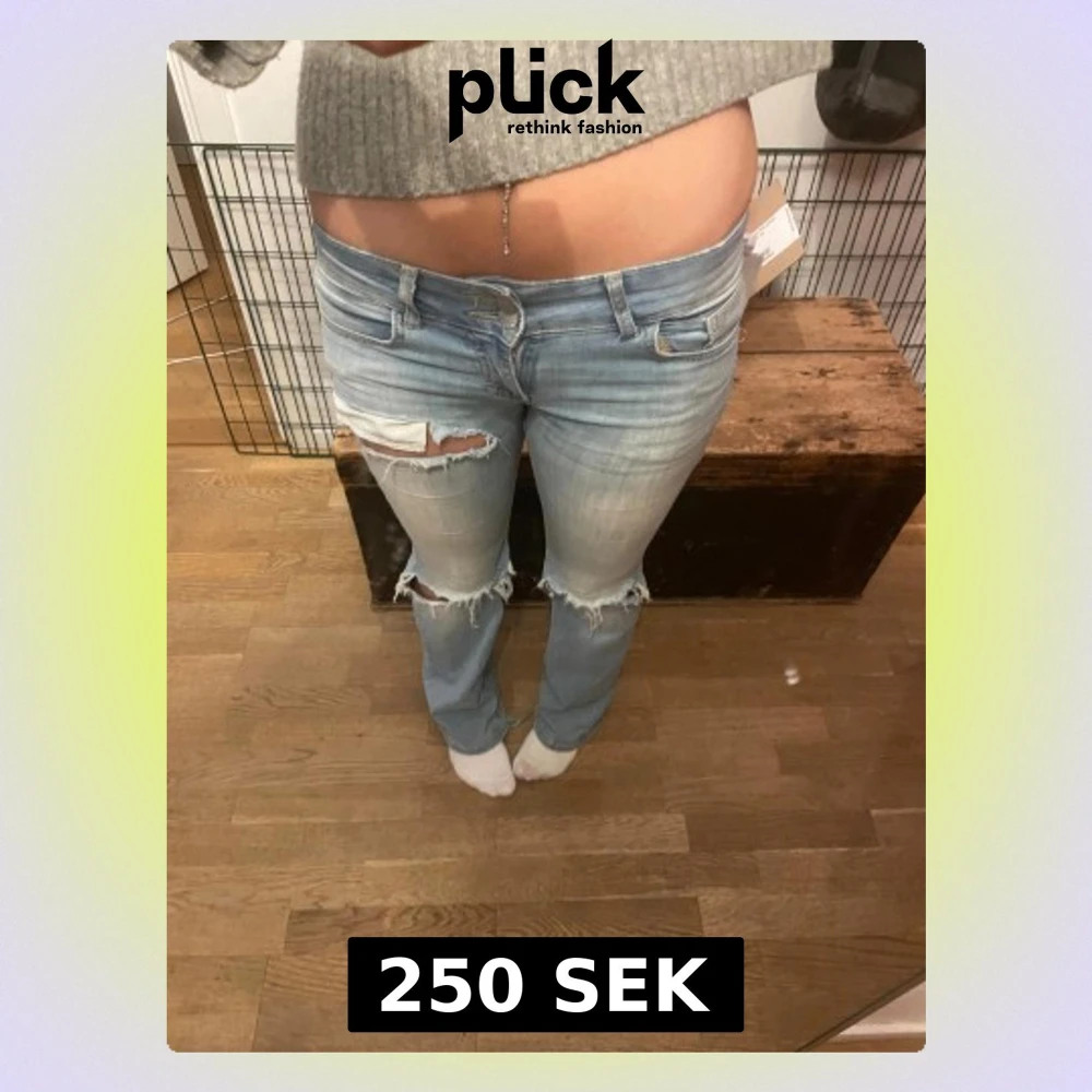 Säljer ett par ljusblå jeans med bootcut passform och låg midja som jag köpte här på Plick. Byxorna har slitna detaljer och revor vid knäna och låren, Dom är väldigt slitna mellan benen som man kan se på en av bilderna därav kan pris diskuteras, innerbenslängd 83cm 💗💗