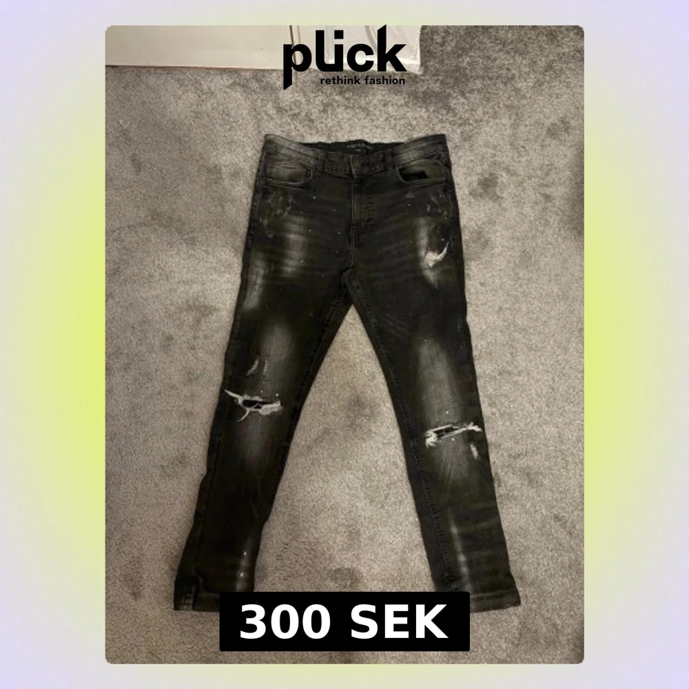 Säljer ett par svarta skinny jeans med slitna detaljer och hål på knäna. Jeansen har en tvättad look och är i stretchigt material för skön passform. Perfekta för dig som gillar en edgy stil. Byxorna är från Jd (supply and demand)