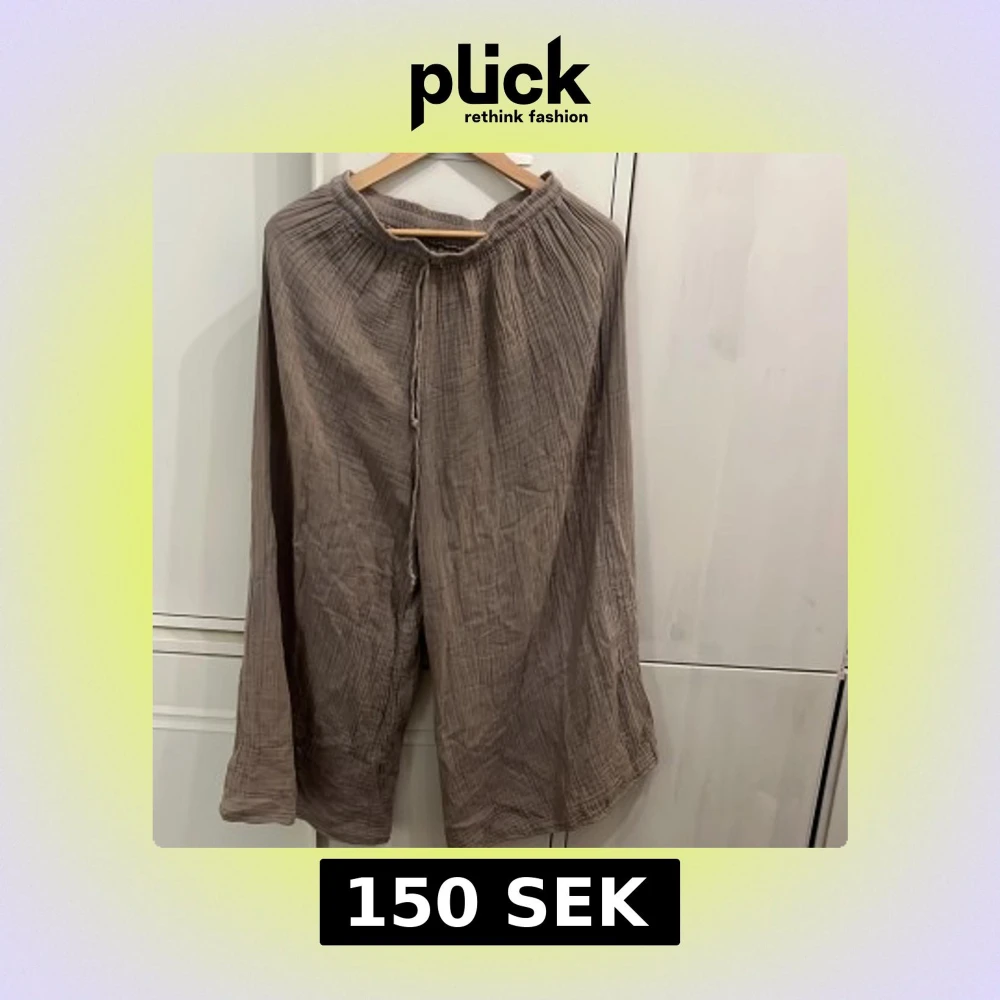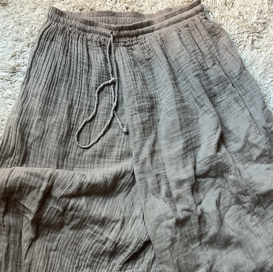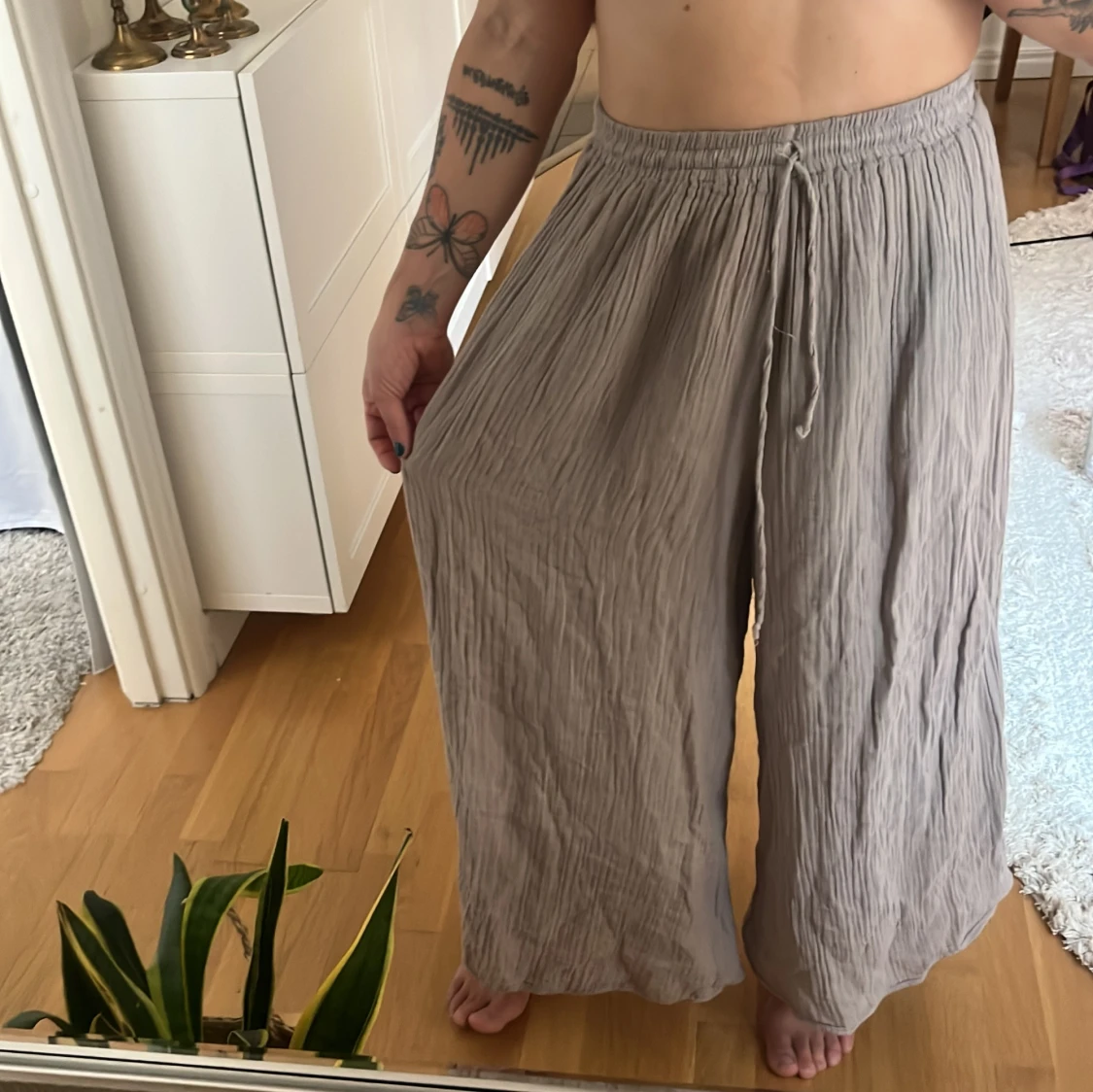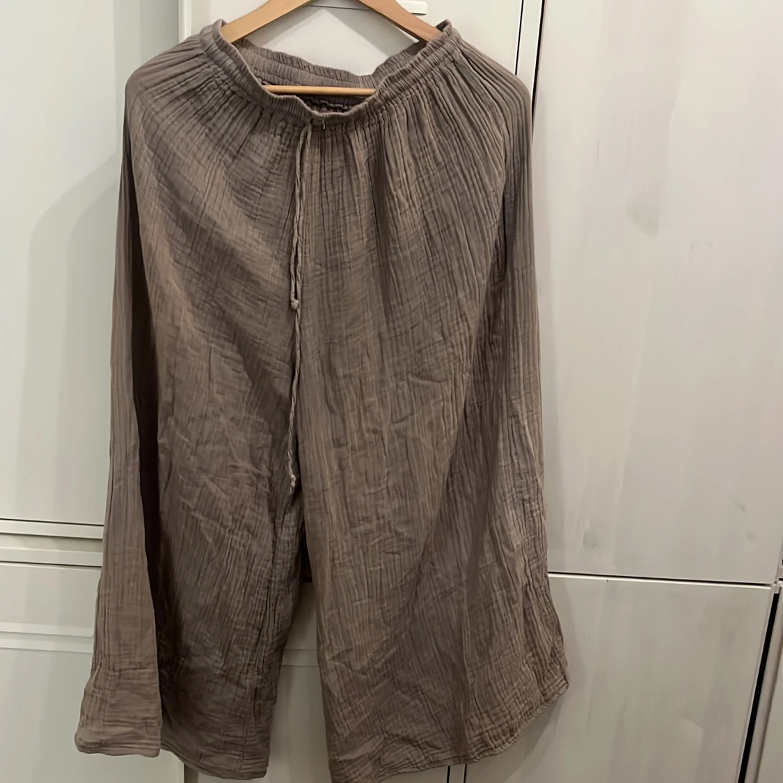 Superbekväma och luftiga bomullsbyxor i beige med bred passform och resår i midjan. Byxorna har snörning i midjan och ett snyggt, krinklat tyg som ger en avslappnad vibe. Perfekta för varma dagar eller när du vill chilla hemma.