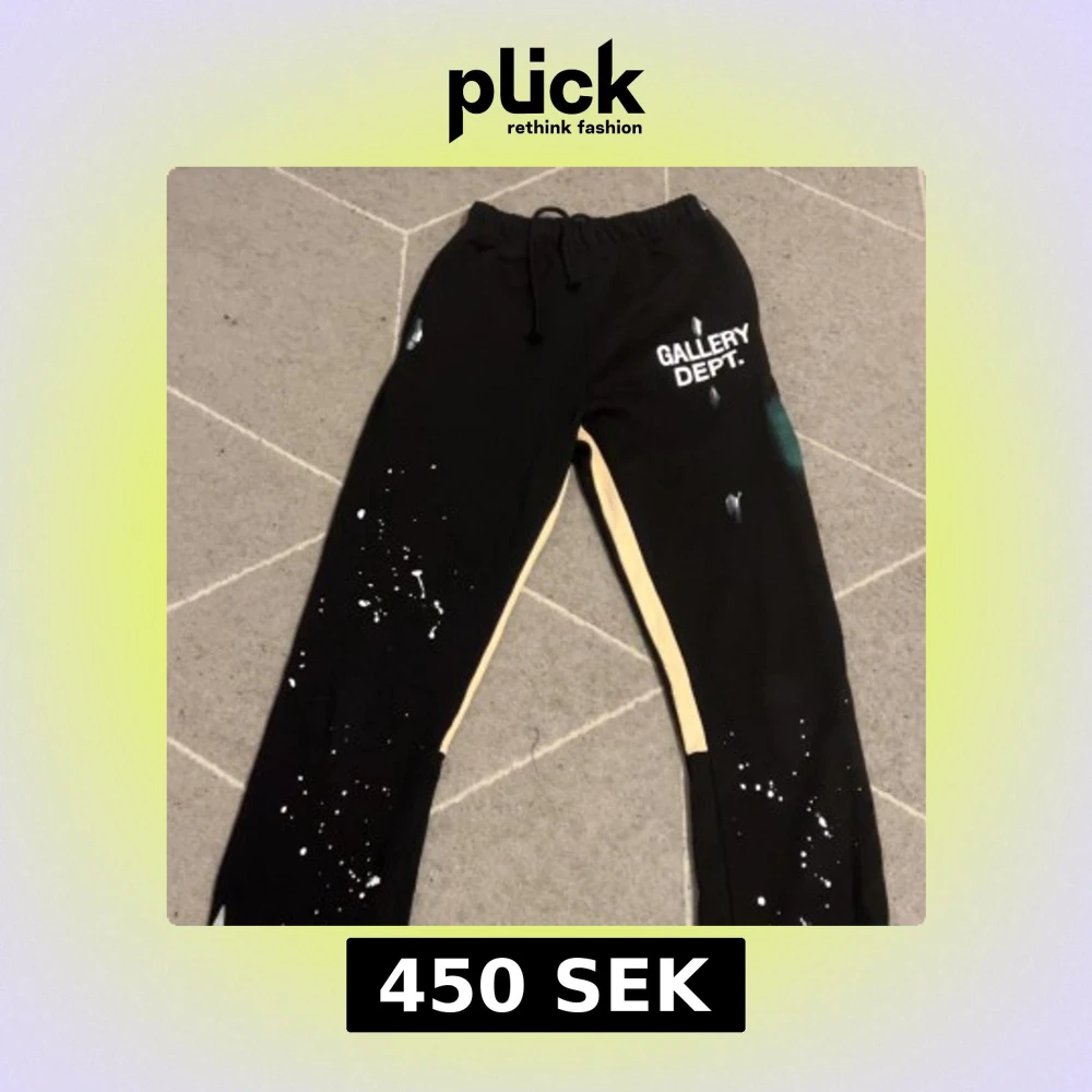 Svarta mjukisbyxor från Gallery Dept med vit logga på höften, snörning i midjan och beige sidopaneler. Byxorna har coola vita färgstänk och en avslappnad passform. Perfekta för dig som gillar streetwear och unik design.