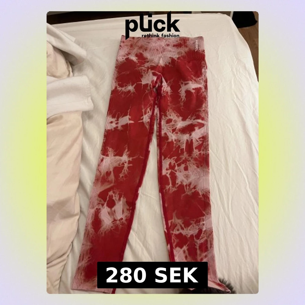 Snygga röda leggings från Rebel i storlek S med coolt tie-dye mönster i vitt. Högmidjade med ribbad linning och scrunch-detalj bak för extra shaping. Perfekta för träning eller chill. Stretchigt syntetmaterial som sitter skönt och följer kroppen. Pris kan diskuteras