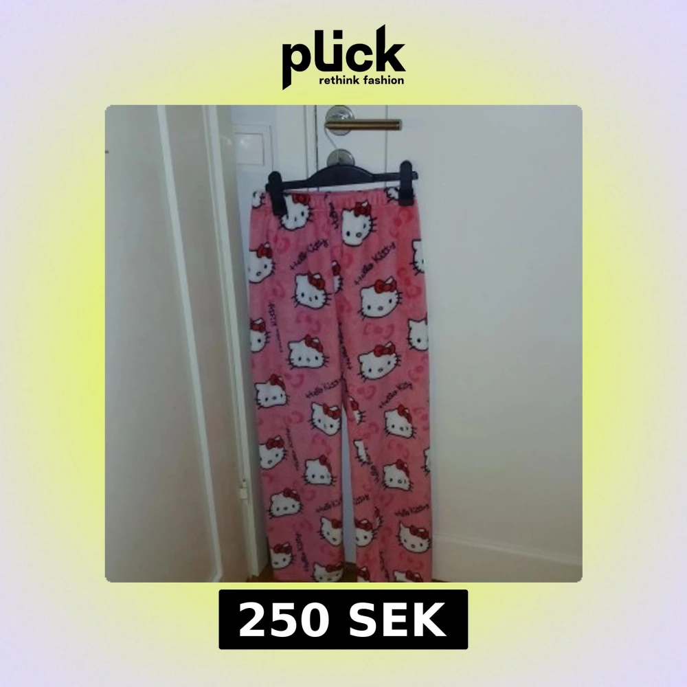 Supermysiga rosa mjukisbyxor med Hello Kitty-tryck över hela byxorna. Byxorna har elastisk midja och är gjorda i mjukt fleece-material, perfekta för chill hemma. Söt design med röda rosetter och hjärtan som detaljer.