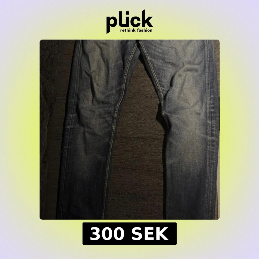 Säljer ett par blå jeans med snyggt slitna detaljer och ljusare partier på låren och knäna. Klassisk femficksmodell med orange sömmar och dragkedja. Jeansen har en rak passform och är tillverkade i robust denim. Litet hål i byxorna där back men kan lätt sys ihop. märke Tiger of Sweden