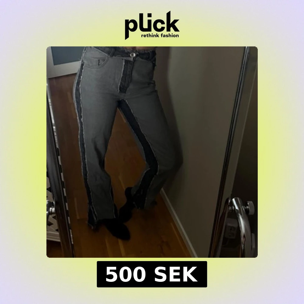 Snygga grå jeans med unika detaljer som dragkedjor vid bensluten och en fransig kant. De har en högmidjad passform och en cool, edgy look med kontrasterande sömmar. Perfekta för att ge din outfit en extra touch. Jag är 174cm och brukar ha S