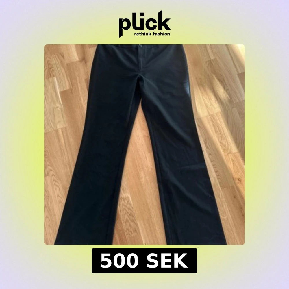 Säljer ett par svarta kostymbyxor med bootcut-modell och låg midja. Byxorna har klassisk knapp- och dragkedjestängning och är i ett mjukt, stretchigt material som sitter snyggt över höfterna och låren. Perfekta om du gillar en stilren och enkel look.