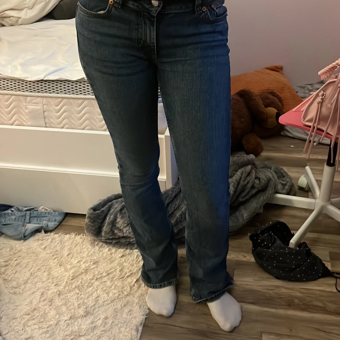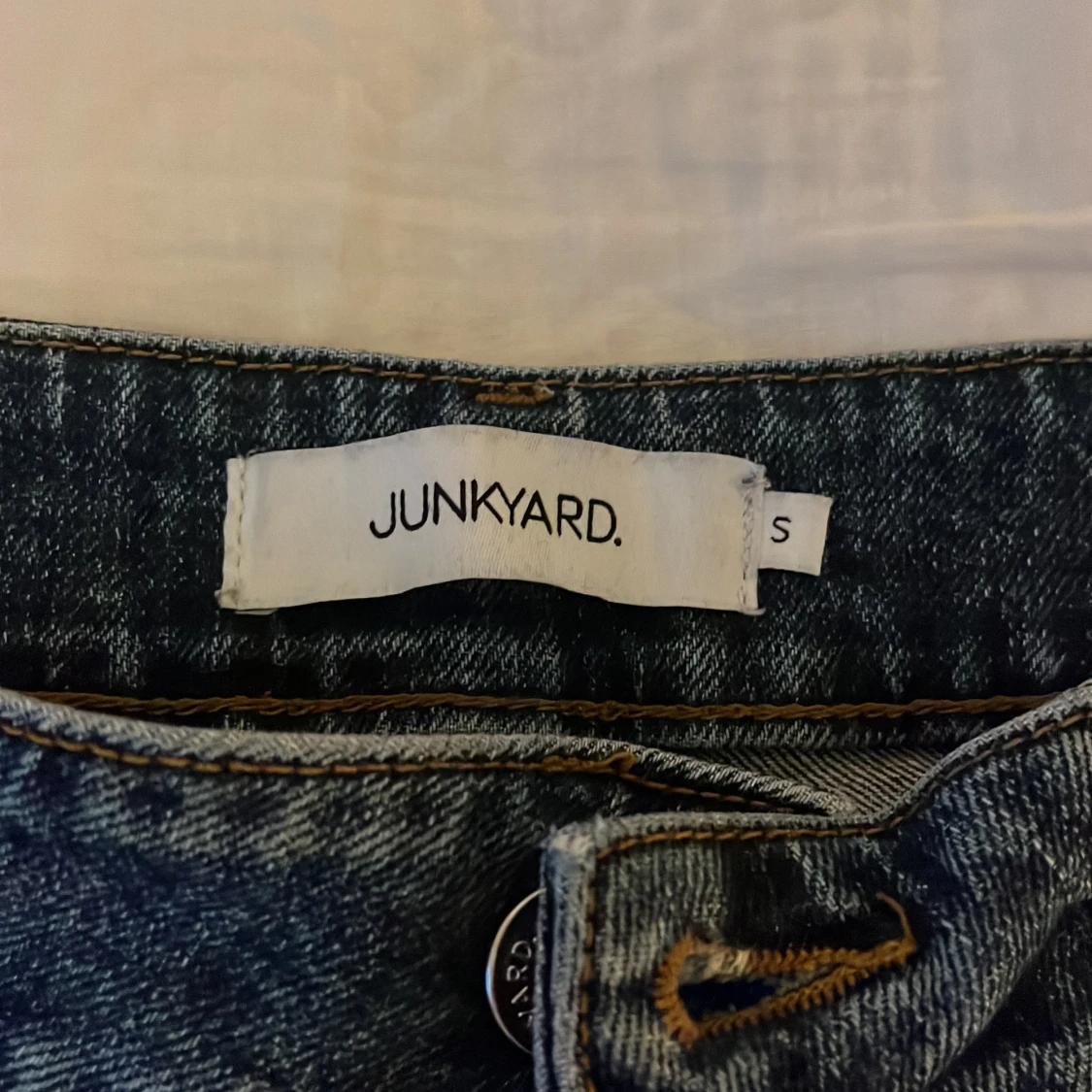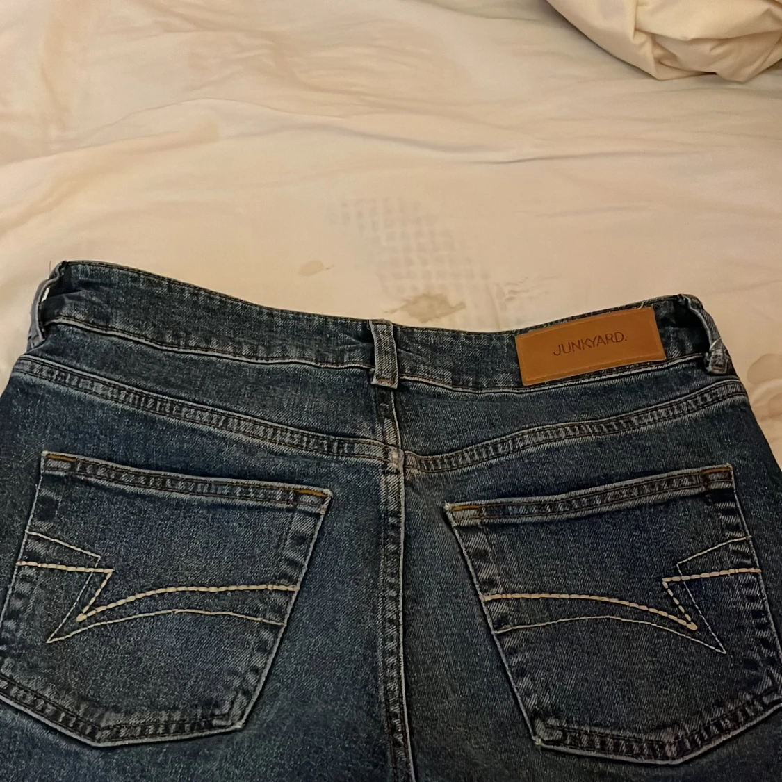 Säljer ett par blå bootcut jeans från Junkyard i storlek S. Jeansen har klassisk femficksdesign, snygga kontrastsömmar och låg midja. Materialet är jeans med en skön passform och coola detaljer på bakfickorna. Perfekta för dig som gillar en tidlös och trendig look. Jag är ca 170 och dom är lite för långa på mig 💗💗