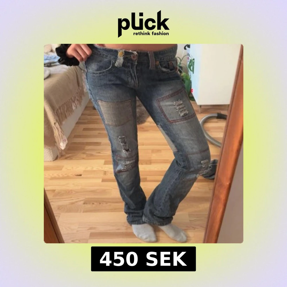 Säljer ett par blå jeans med coola patchade detaljer och slitningar på både fram- och baksida. Sååå unik och cool🤩🤩 de är väldigt lågmidjade och skulle säga att de är mindre bootcut/straight. Är 168 och bär S