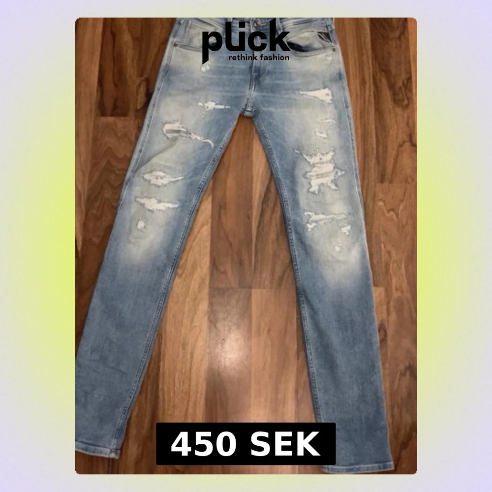 Säljer ett par ljusblå jeans med slitningar och distressed detaljer på både fram- och baksida. Jeansen har klassisk femficksdesign, normal midja och är tillverkade i mjukt denimtyg. Perfekta för en avslappnad och trendig look. STORLEK 29/32