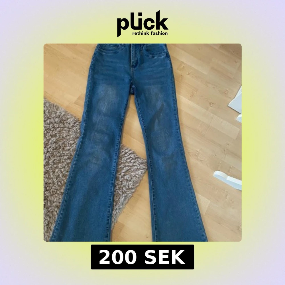 Snygga blå jeans med bootcut passform och hög midja. Klassisk femficksdesign och knappstängning fram. Jeansen har en lätt tvättad look och är tillverkade i jeansmaterial som känns slitstarkt och bekvämt. Perfekt för dig som gillar retrovibbar och vill ha ett coolt snitt.aldrih använt och köpte för 300 men säljer för 200 kr.