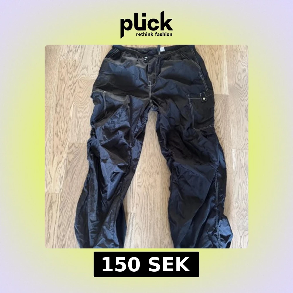 Svarta cargopants från H&M Divided i storlek S. Byxorna har flera fickor, resår i midjan och synliga kontrastsömmar. Materialet är lätt och syntetiskt, perfekt för en avslappnad streetstil.