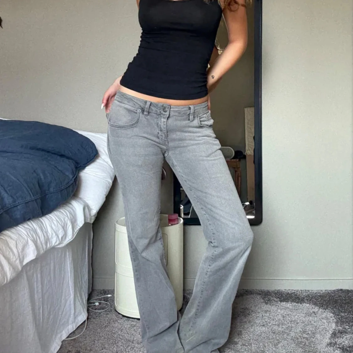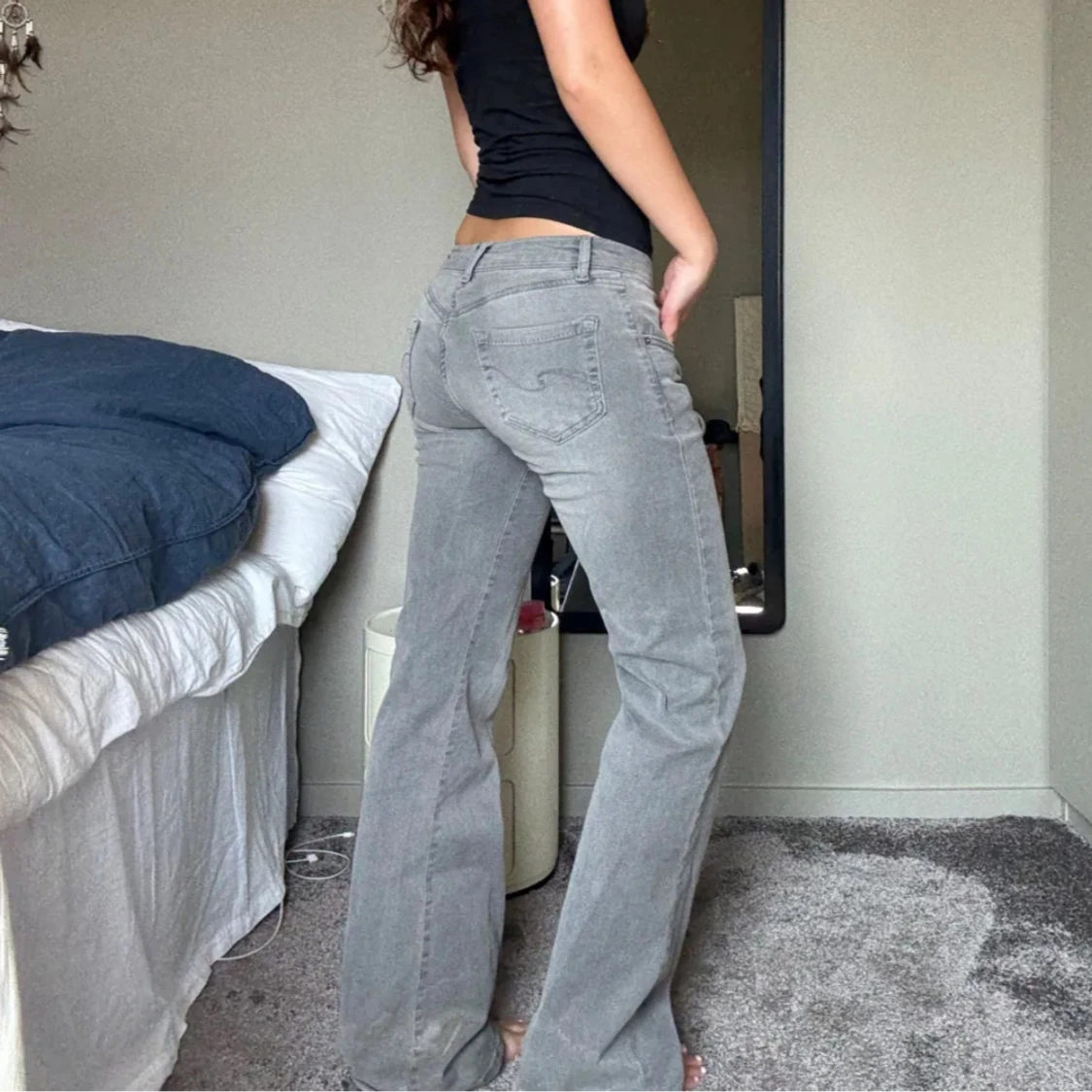 Säljer ett par gråa jeans med bootcut-modell och låg midja. Har vattenfläck längst ned på benen men går bort vid tvätt!