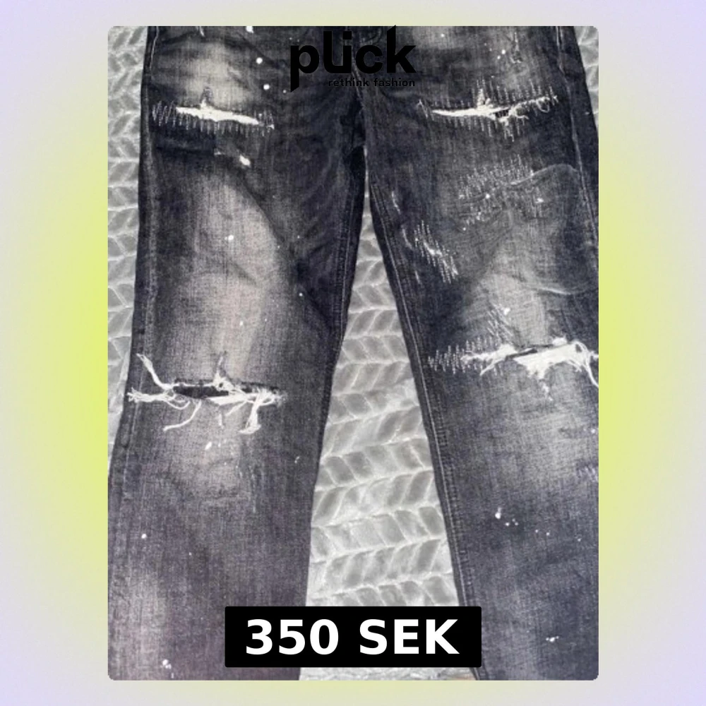 Säljer ett par svarta jeans med coola slitningar och vita färgstänk. Jeansen har raka ben och en avslappnad passform. Perfekta för dig som gillar en edgy streetstil. Materialet är klassisk denim och de har fickor både fram och bak.
