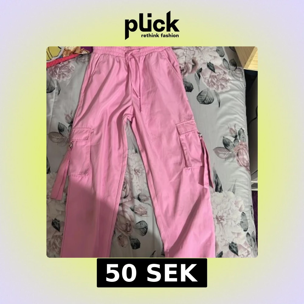 Säljer ett par rosa cargopants med elastisk midja och snörning. Byxorna har praktiska fickor på sidorna och dekorativa band. Perfekta för en avslappnad stil.