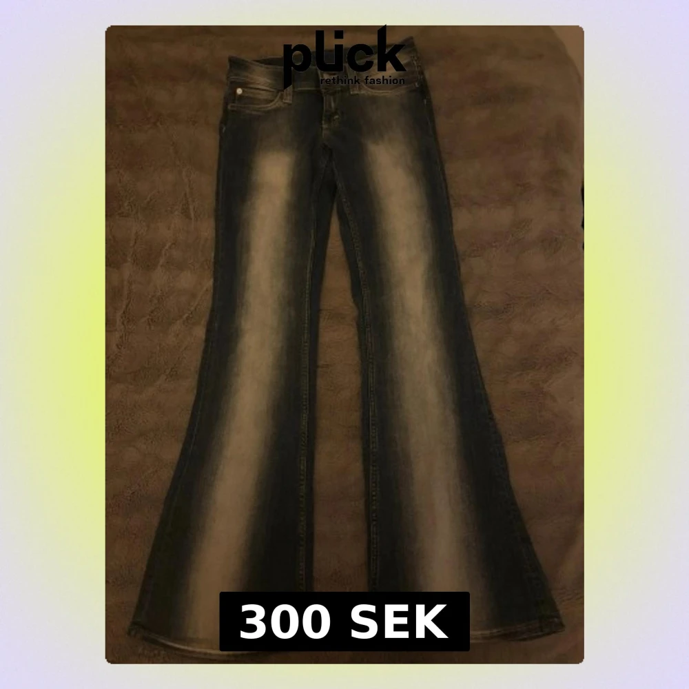 Snygga bootcut jeans med breda ben och ljus tvätt längs benen. Använda några gånger men inget som syns förutom att det är lite smutsigt längst ner(sista två bilderna) men det syns knappt. Storlek 29/32 skulle dock säga att den är liten i storleken jag brukar ha jeans i 27.