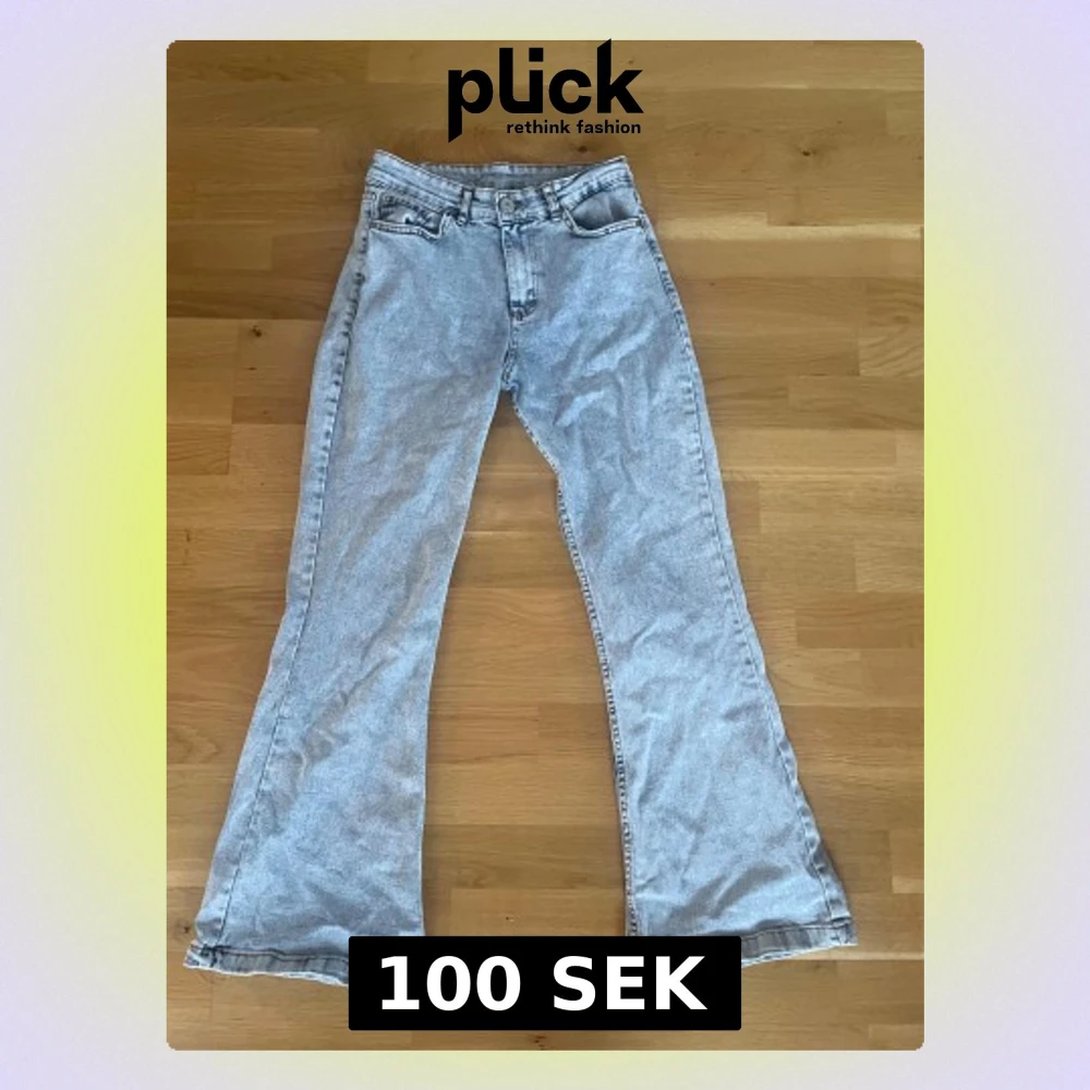 Säljer ett par ljusblå bootcut jeans med hög midja. Klassisk femficksmodell och snygg tvättad denim. Perfekta för dig som gillar retrovibbar och vill ha ett par jeans som sticker ut lite extra.