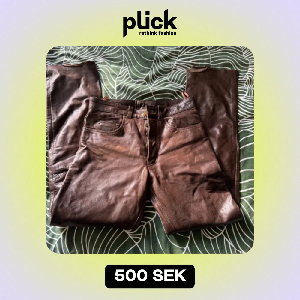 Mina älskade läderbyxor! Otroligt coola med äkta läder och därmed tjockare och känns som mer exklusivt material. Straight fit. Finns en liten fläck som är nog möjlig att få bort