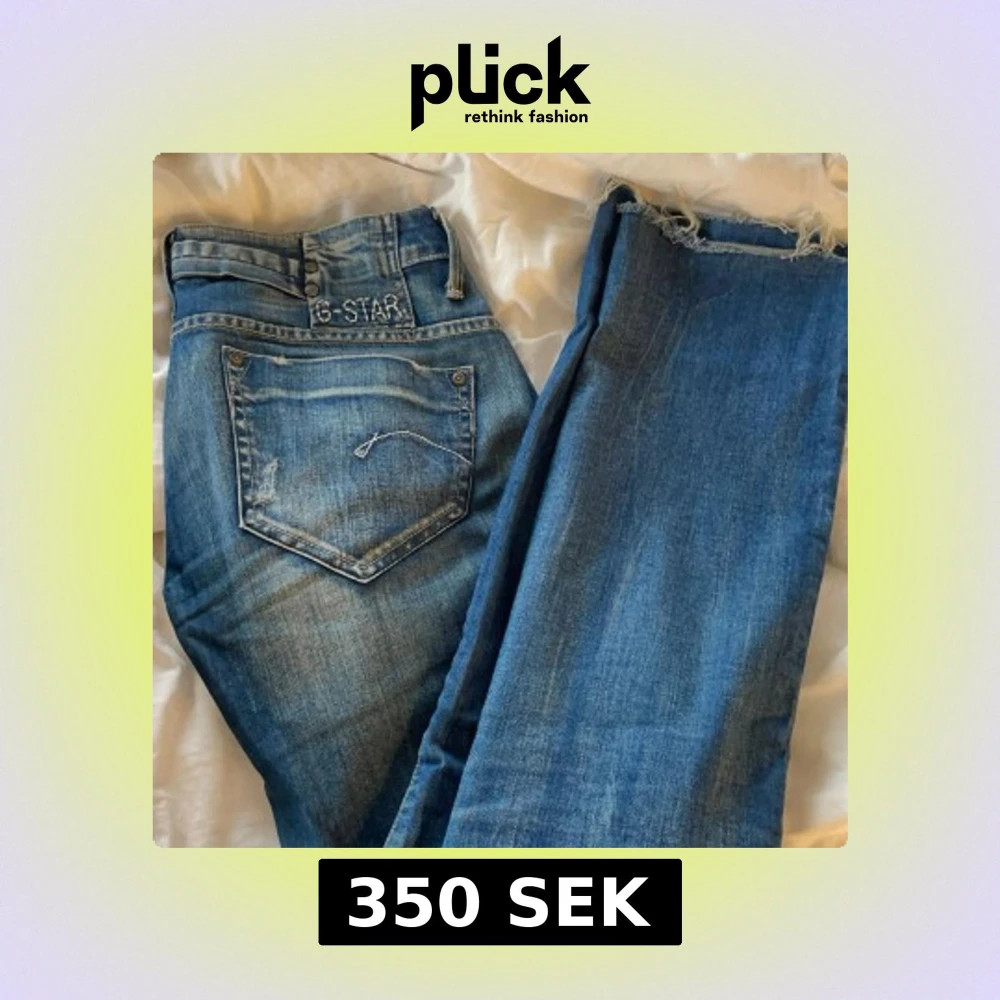 Säljer ett par snygga blå jeans från G-Star med slitna detaljer och fransig nederkant. De är storleken 28,34 och passar mig perfekt i längden, jag är 1,66. Det är väldigt lågmidjade och sitter perfekt i midjan. Säljer pga inte min stil.