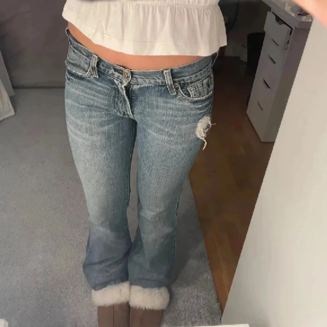 Säljer ett par blå bootcut jeans med slitna detaljer. (Lånade bilder) 38cm midja, 83 innerbenslängd💕Köpte dessa av en annan tjej här på Plick men det passade tyvärr inte💕