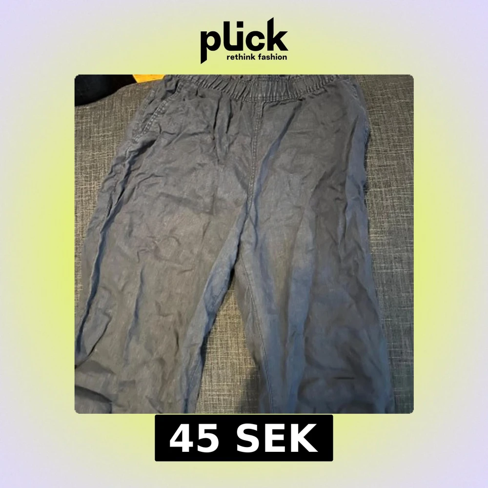 Säljer ett par grå linnebyxor med avslappnad passform och resår i midjan. Byxorna har sidfickor.
