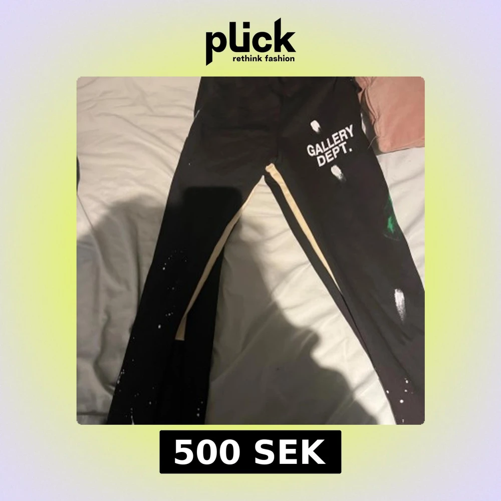 Svarta mjukisbyxor från Gallery Dept. med vitt tryck på ena benet och coola färgstänk i vitt och grönt. Byxorna har beige sidopaneler och elastisk midja för skön passform. Perfekt för dig som gillar streetwear och unik design.