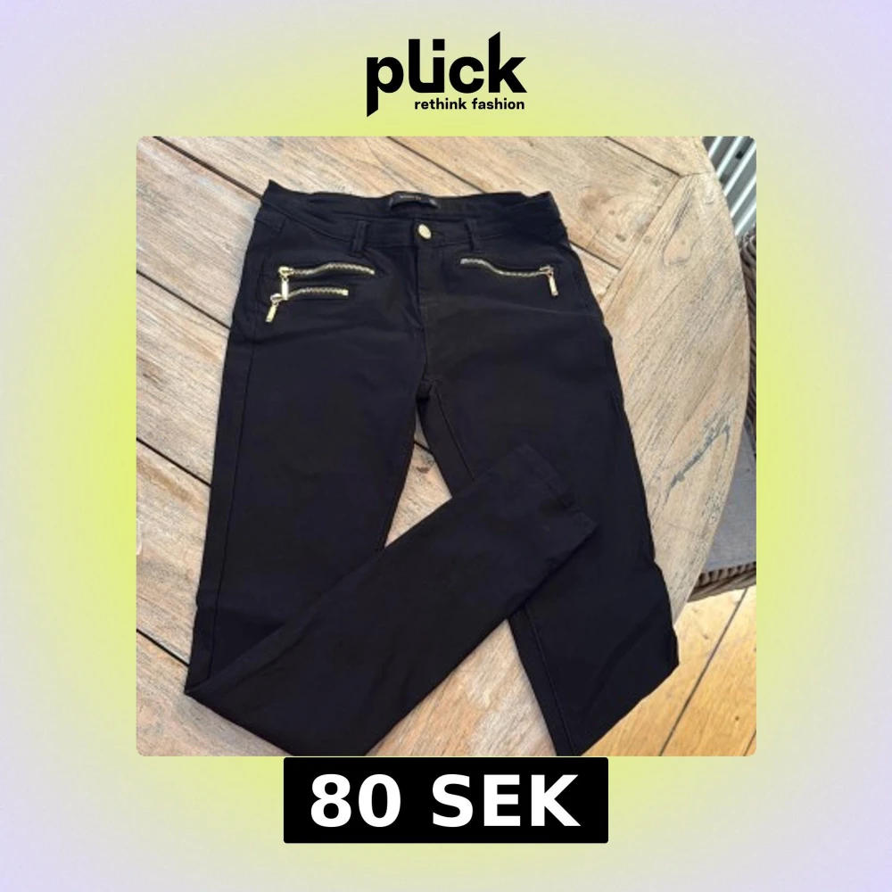 Svarta byxor från MONDAY med snygga guldiga dragkedjor framtill. Byxorna har smal passform, normal midja och klassiska bakfickor. Materialet känns mjukt och stretchigt, perfekt för en stilren look. Midjemått ca 66 cm. Upplever dem som S.