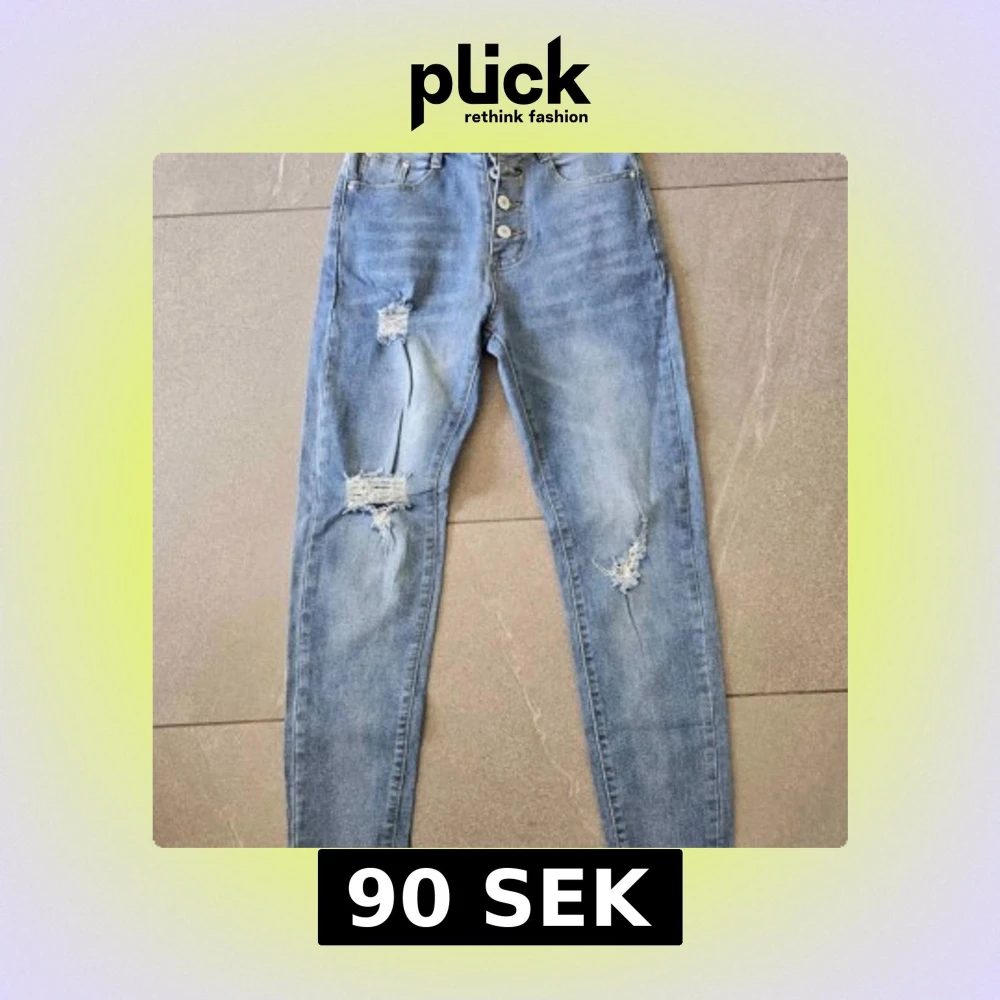 Snygga ljusblå skinny jeans med slitna detaljer på båda benen och knappar i gylfen. Jeansen har klassisk femficksdesign och är perfekta för en avslappnad streetstil.