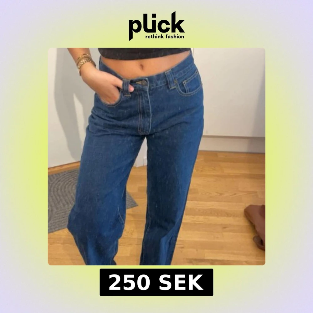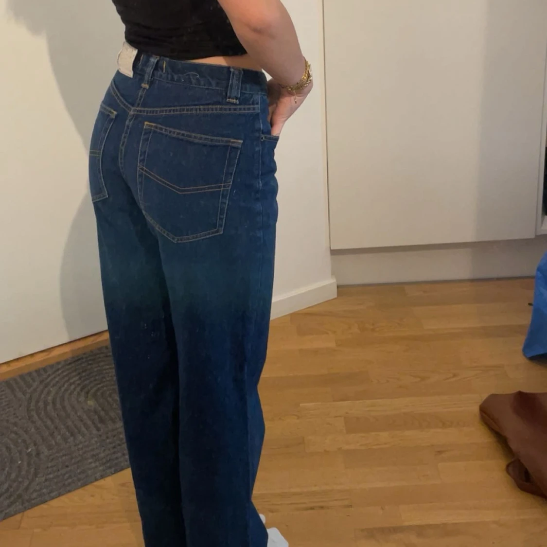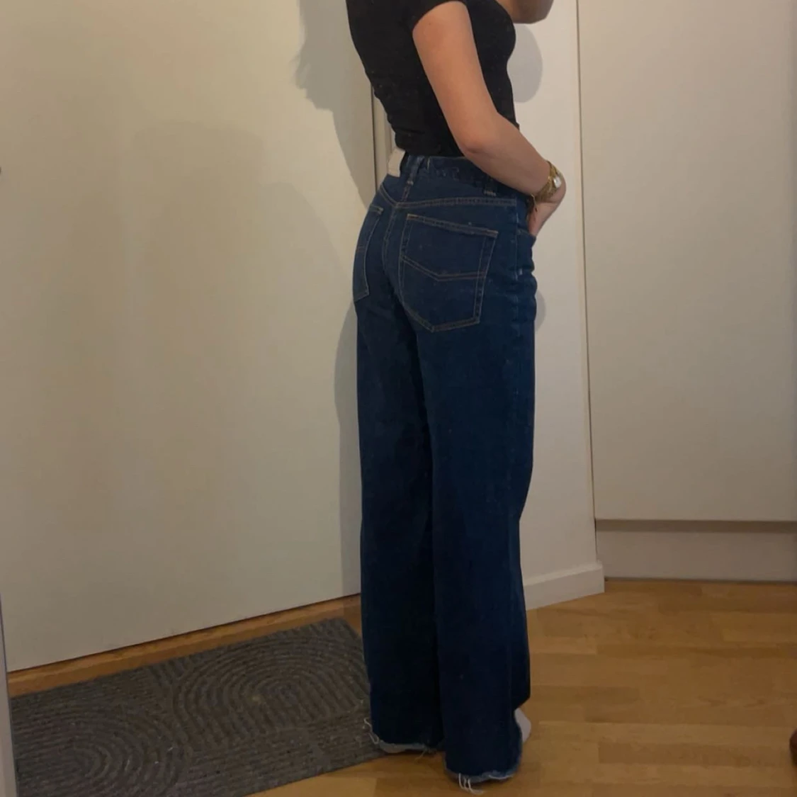 Snygga mörkblå jeans med hög midja och wide fit. Klassisk femficksmodell med kontrastsömmar och raka ben