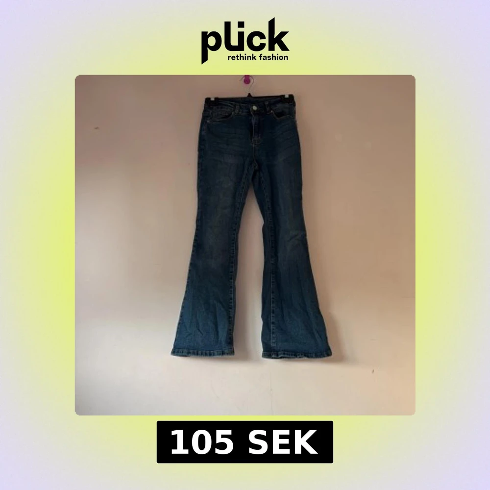 Snygga blå bootcut jeans med klassisk femficksdesign och knappgylf. Perfekta för en avslappnad stil med en touch av retro. Passar bra till både sneakers och boots.