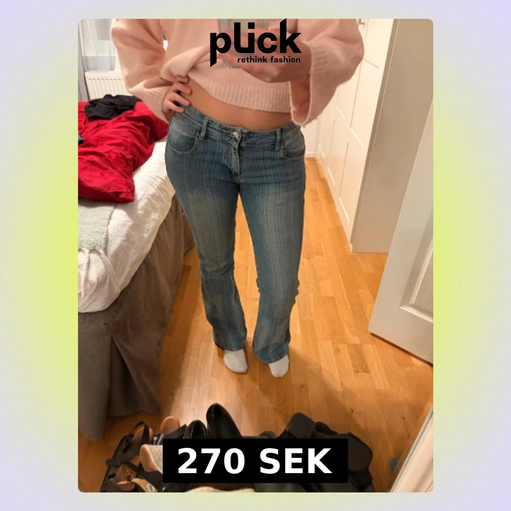 Säljer ett par blå bootcut jeans med låg midja och klassisk femficksdesign. Måtten: midjemåttet är 37cm och innerbenslängden är 77cm, de passar mig jättebra i längden som är 170cm. Jeansen har en snygg tvätt med ljusa partier och subtila vertikala ränder som ger en vintagekänsla. Perfekta för dig som gillar 00-talsstil och vill ha ett par jeans med lite utsvängda ben.