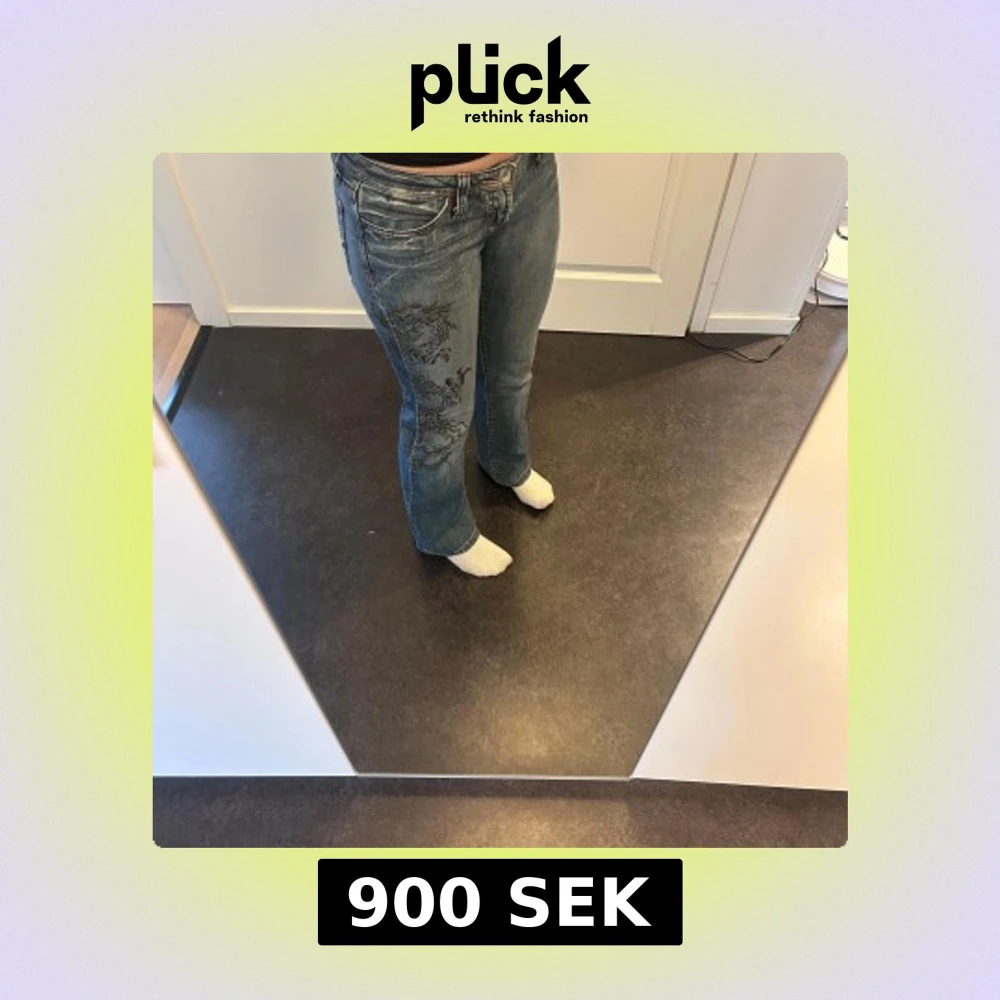 Snygga blå jeans med unikt drakmotiv på låret. Helt utan defekter! Så snygga och verkligen one of a kind