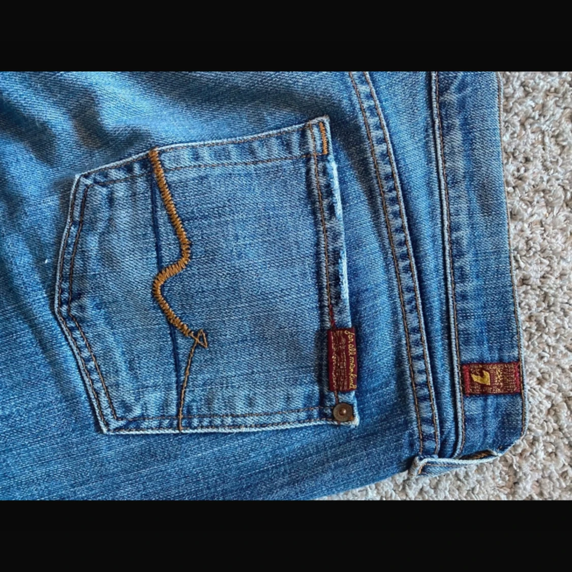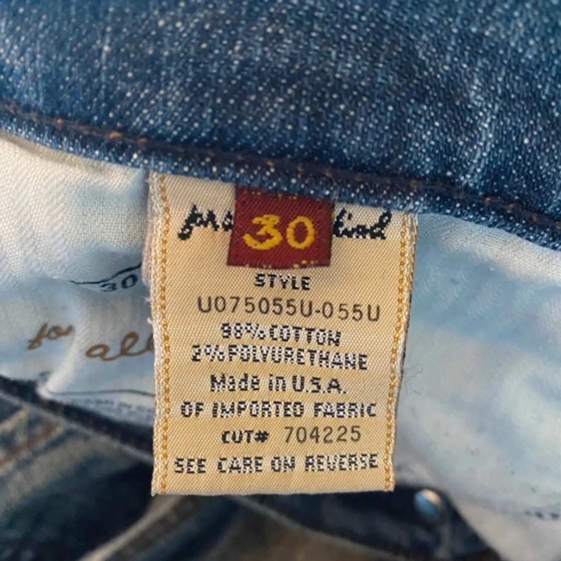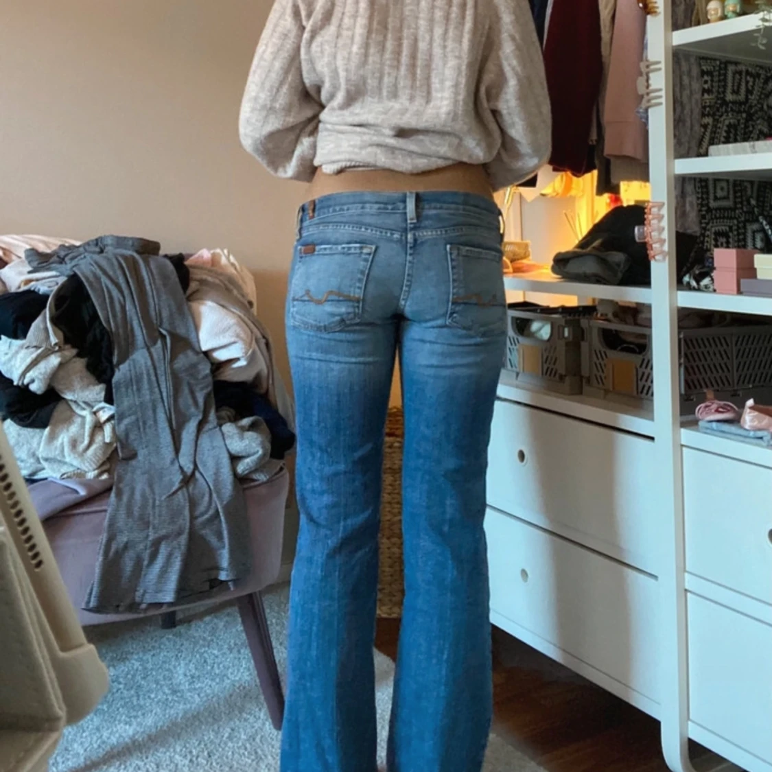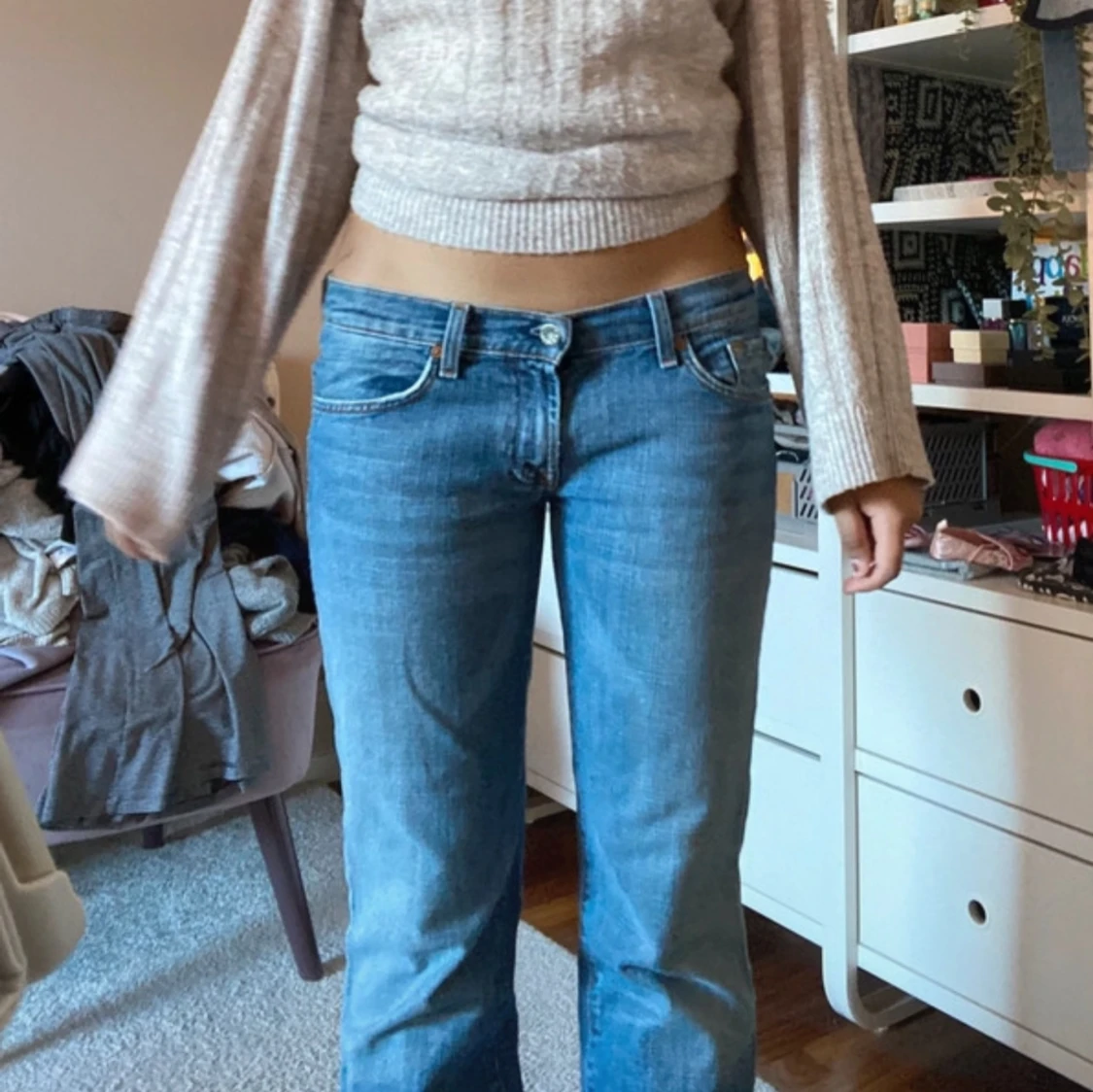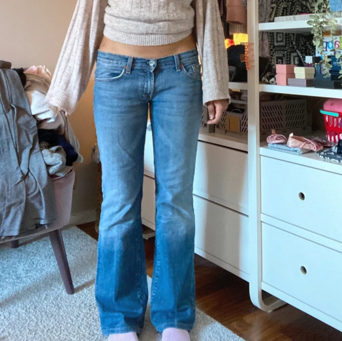 Snygga blå bootcut jeans med låg midja, storlek 30 passar s/m. Dom är köpta på Sellpy och är används fåtal gånger. Midjemått rakt över - 40 innrrbenelänhd- 78 gren-19