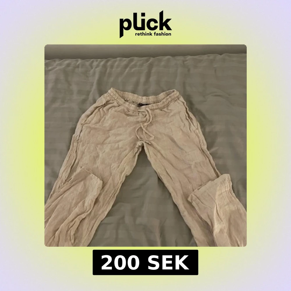 Snygga, låg midjade och bekväma beige linnebyxor med elastisk midja och snörning. Perfekta för en avslappnad stil. Passar bra till en enkel topp för en somrig look.