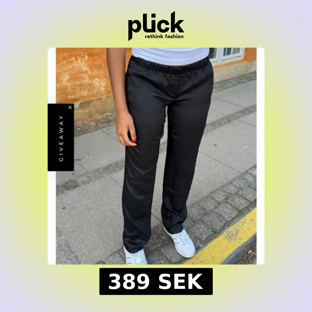 Snygga svarta byxor med rak passform och resår i midjan. Materialet har en satin-liknande glans som ger en clean och stilren vibe. Perfekta att styla med sneakers och crop top för en chill men trendig look.