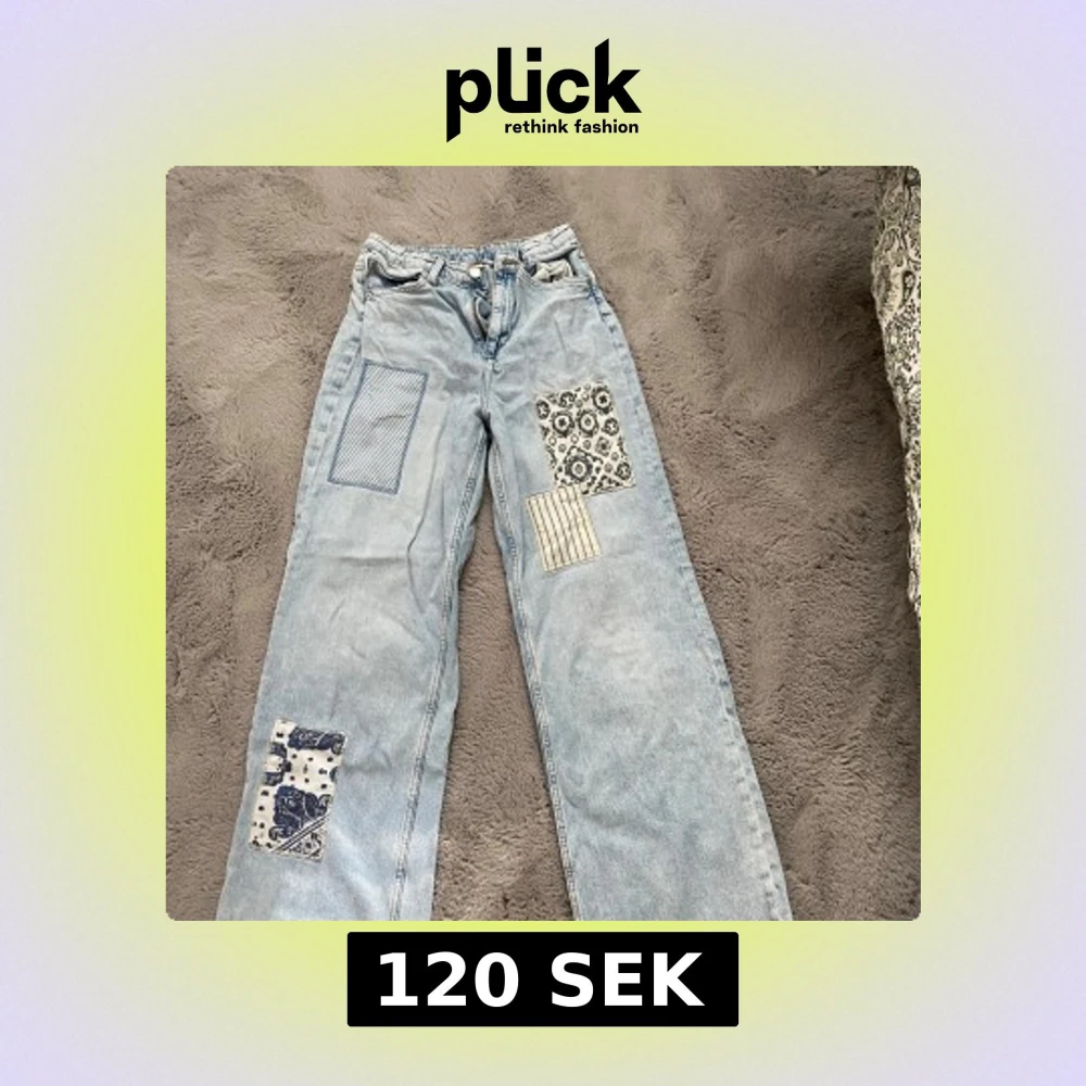 Unika ljusblå jeans med flera olika patchwork-detaljer. Straight passform med ganska hög midja. Storleken är typ S tror jag. Men kontakta gärna utifall ni har några frågor ❤️❤️