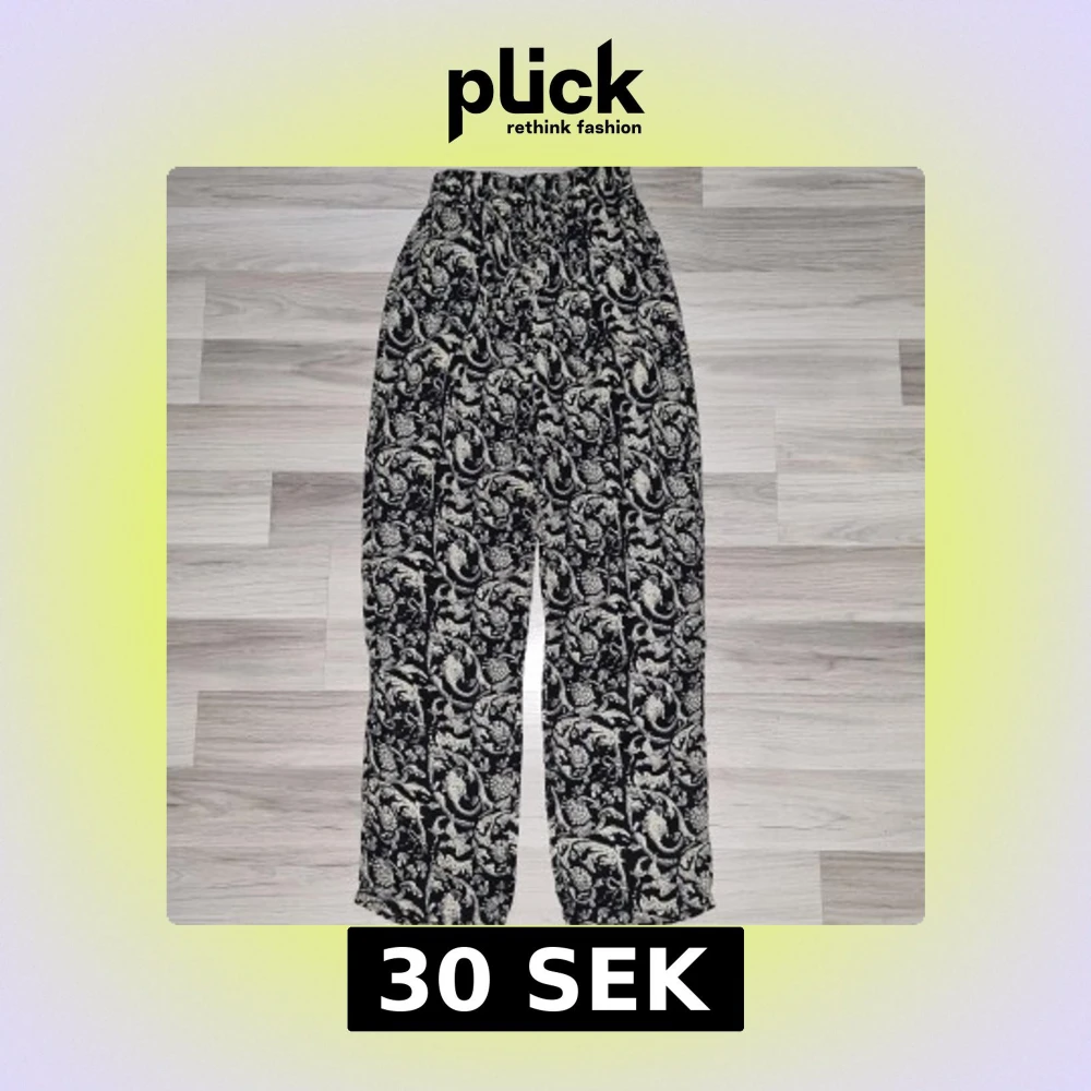 Snygga svarta byxor med vitt blommigt mönster och elastisk midja. Lätta och luftiga, perfekta för dig som gillar en avslappnad stil. Mjukt material som känns skönt mot huden och ger en cool vibe till outfiten. Sömmen har gått upp i vänster sida av midjan, lätt att fixa.