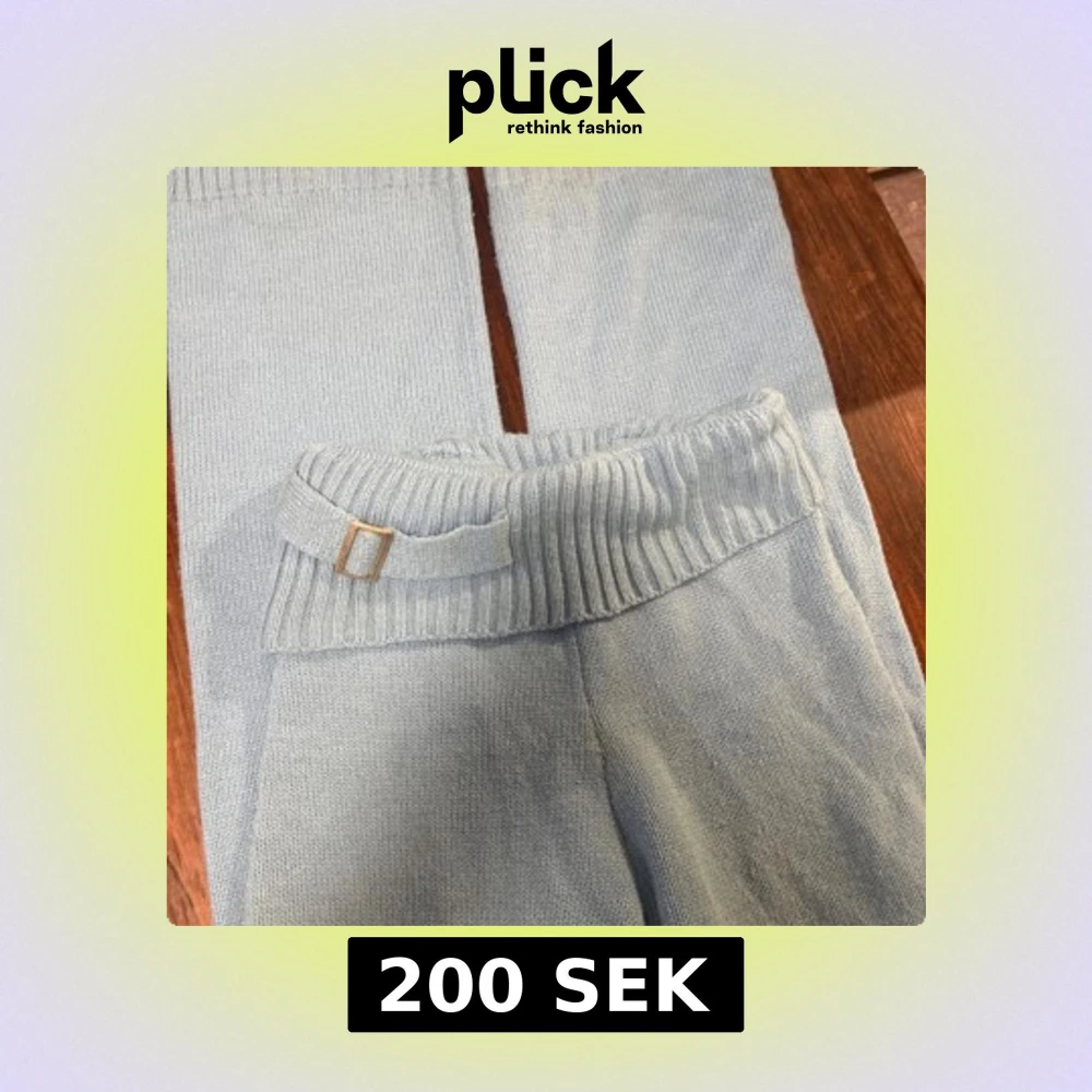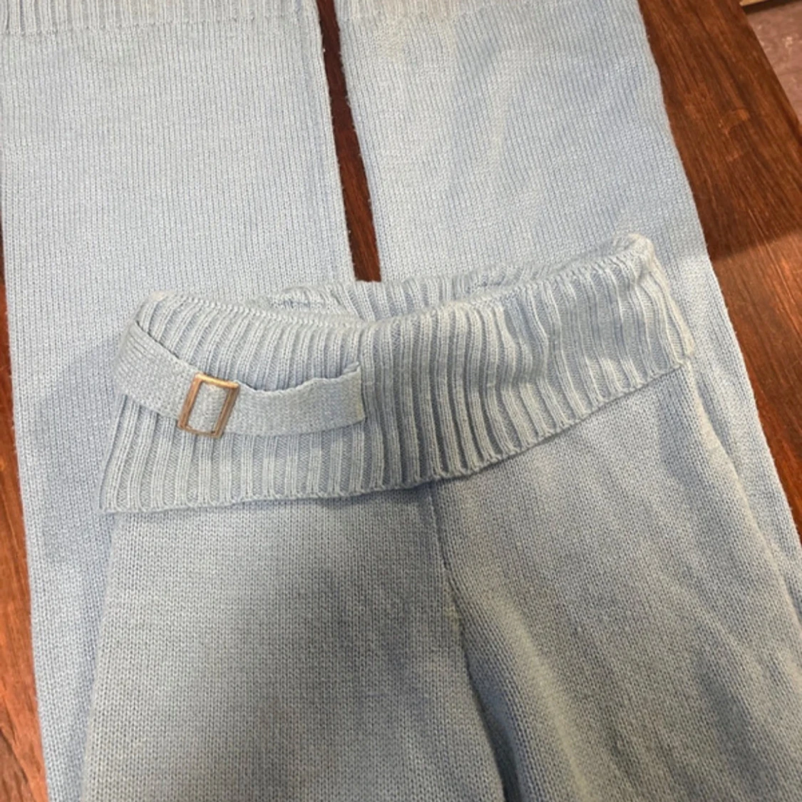 Säljer ett par ljusblå stickade mjukisbyxor med ribbad midja och dekorativt bälte med metallspänne. Byxorna har en avslappnad passform och är perfekta för chill dagar hemma. Materialet är mjukt och skönt mot huden.