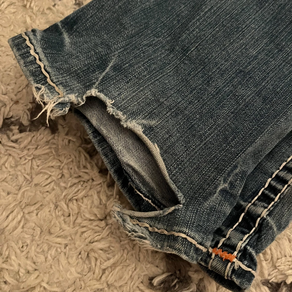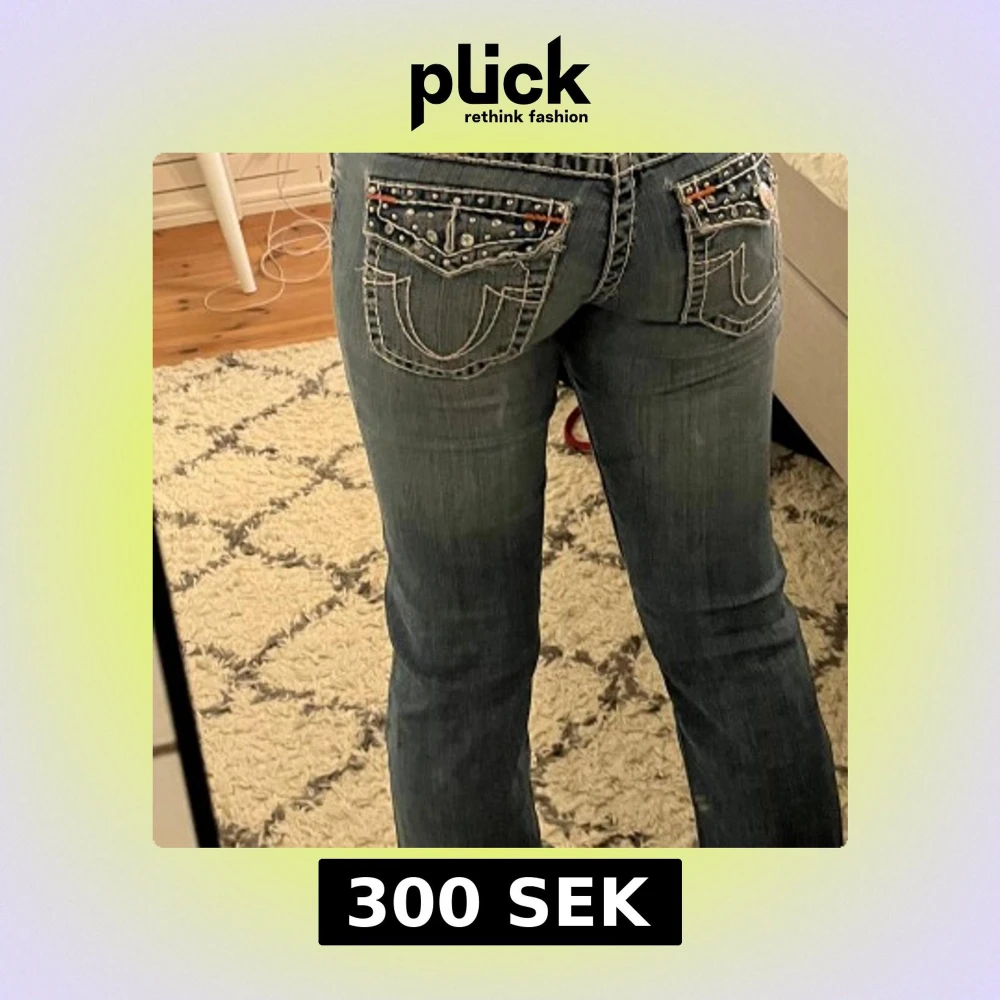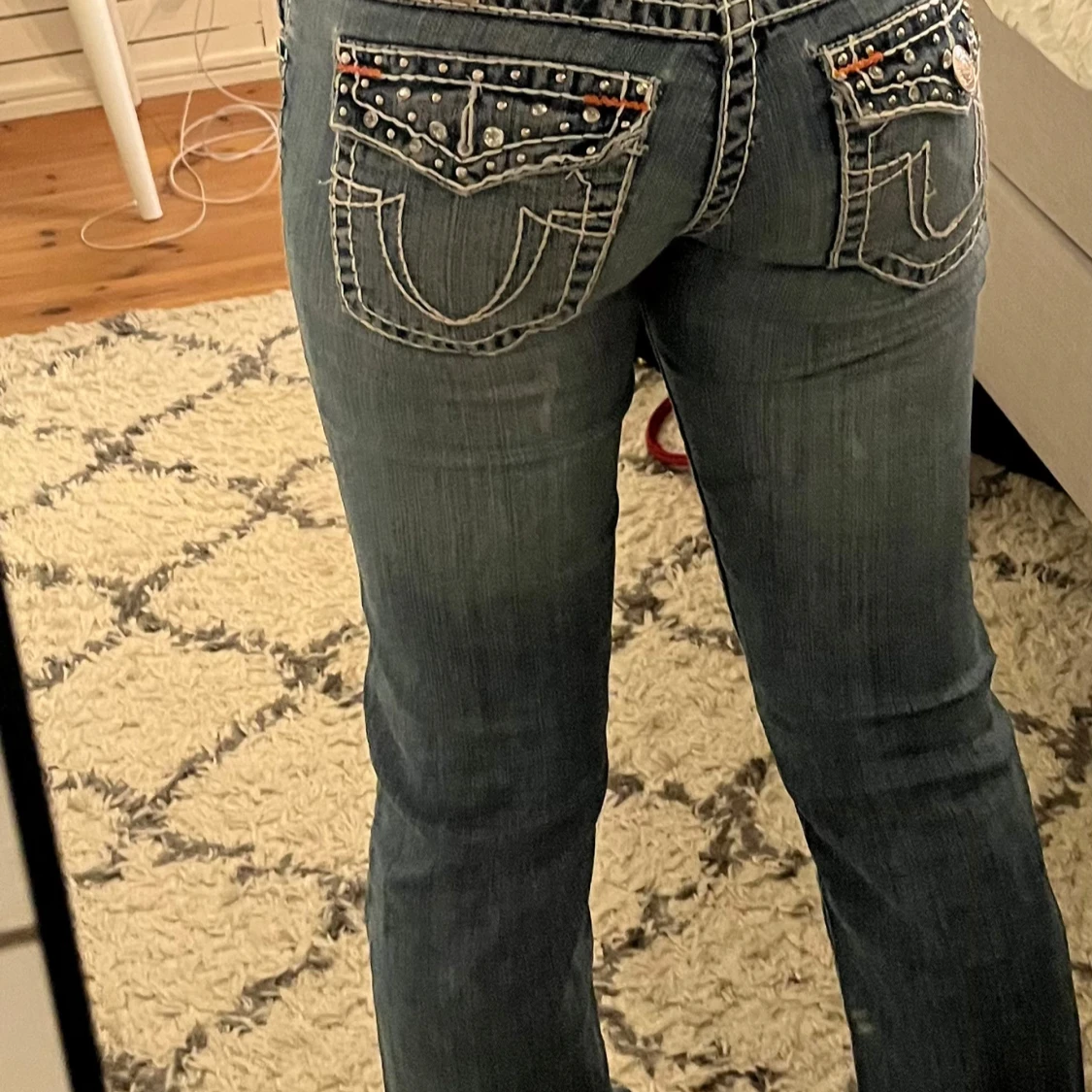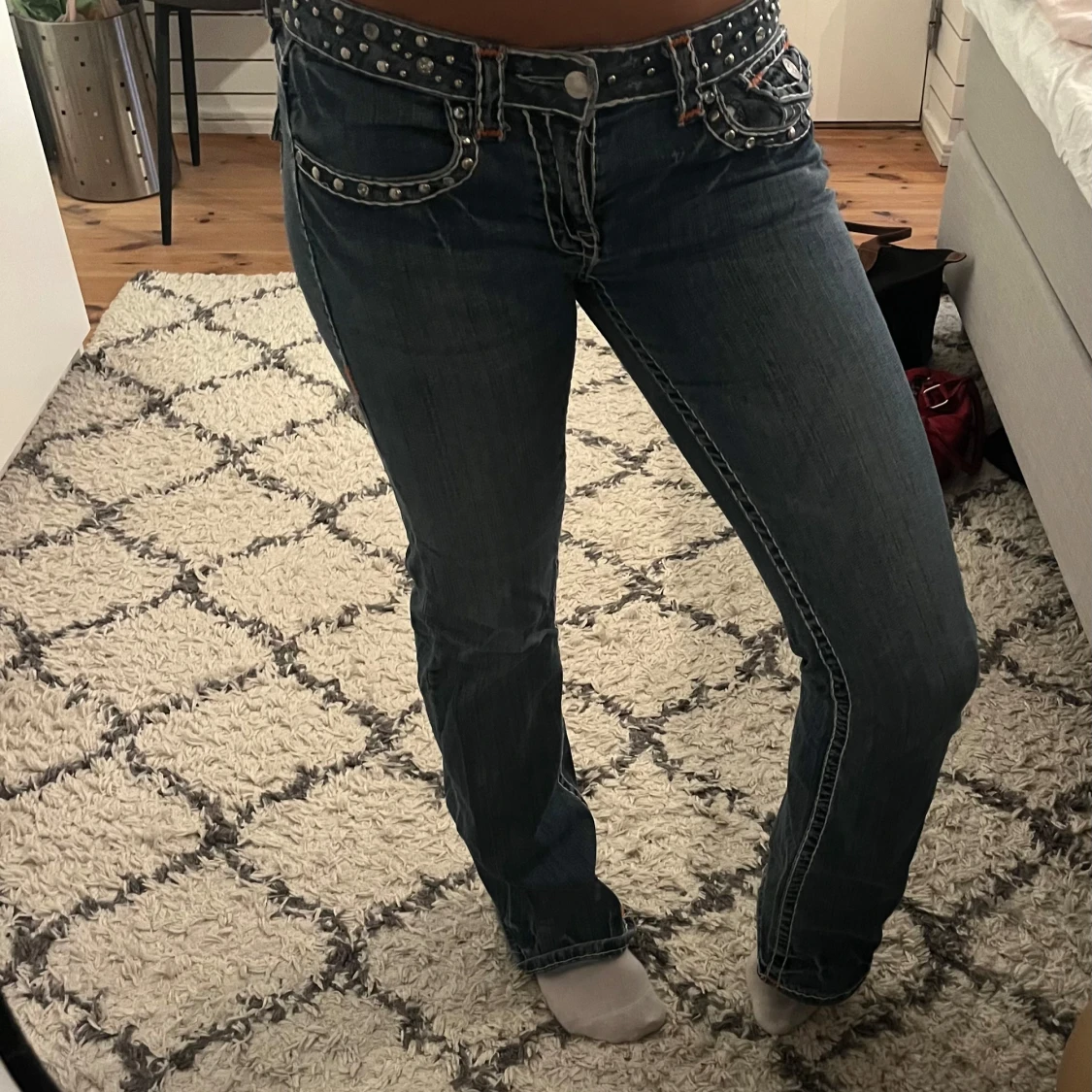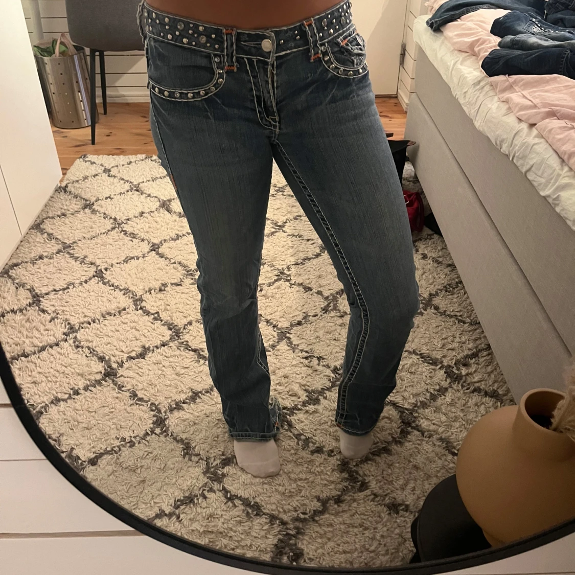 Snygga blå jeans med unika detaljer som broderade bakfickor och nitar. De har en bootcut-stil och låg midja, jag är 168 för referens✨ är lite slitna längst ner på ett av benen men inget som märks av.