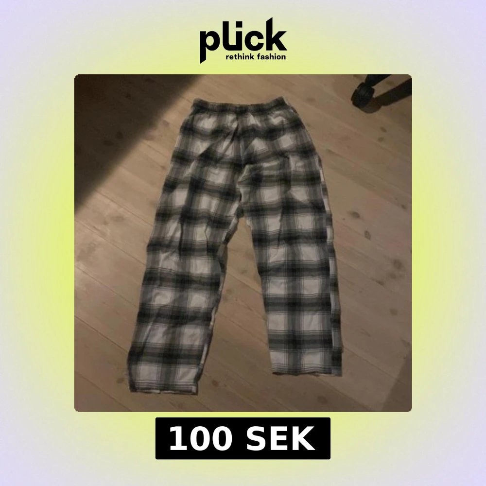 Säljer ett par sköna mjukisbyxor med svart, grått och vitt rutmönster. Byxorna har resår i midjan och är tillverkade i mjuk bomull, perfekta för chill dagar hemma.