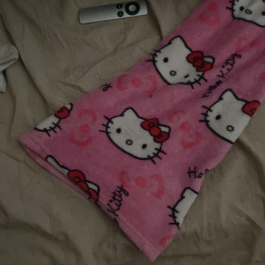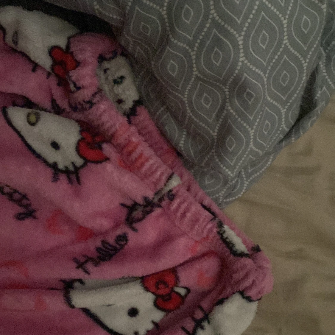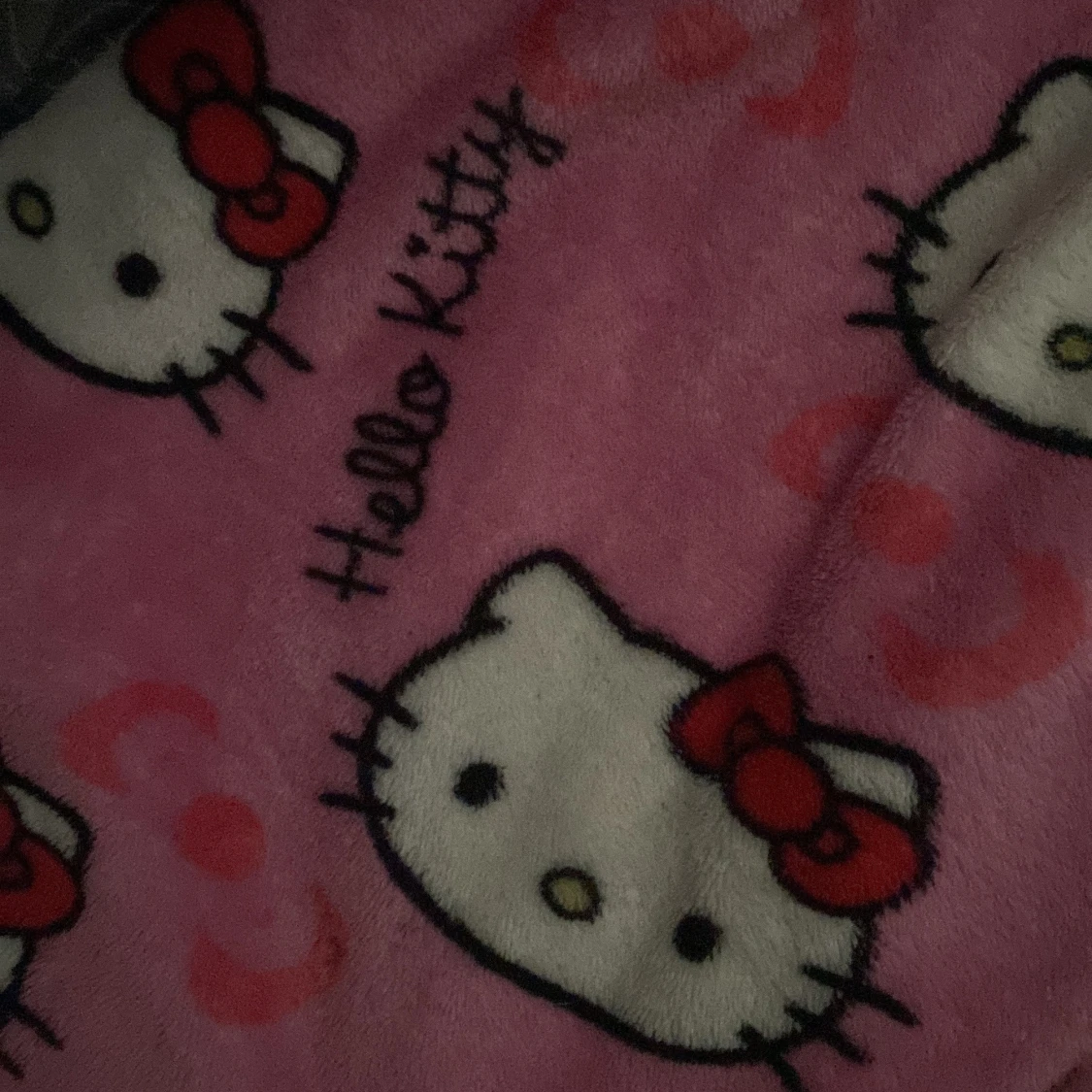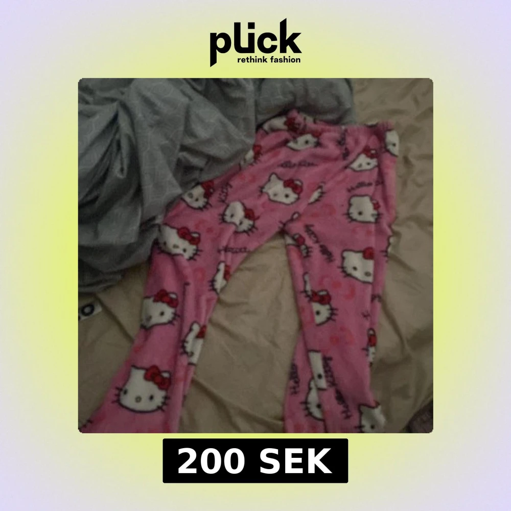 Supergulliga rosa mjukisbyxor med Hello Kitty-motiv och resår i midjan. Byxorna är i mjuk fleece och har ett lekfullt mönster med Hello Kitty-ansikten och röda rosetter över hela tyget.