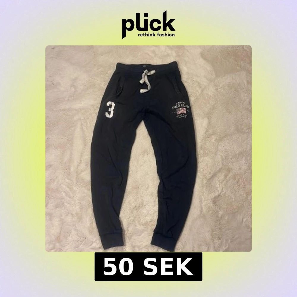 Blåa mjukisbyxor från Vinson Polo Club med vita tryckdetaljer, snörning i midjan och muddar vid bensluten. Byxorna har fickor på sidorna och en sportig look med siffran 3 tryckt på ena benet. Perfekta för chill eller träning.