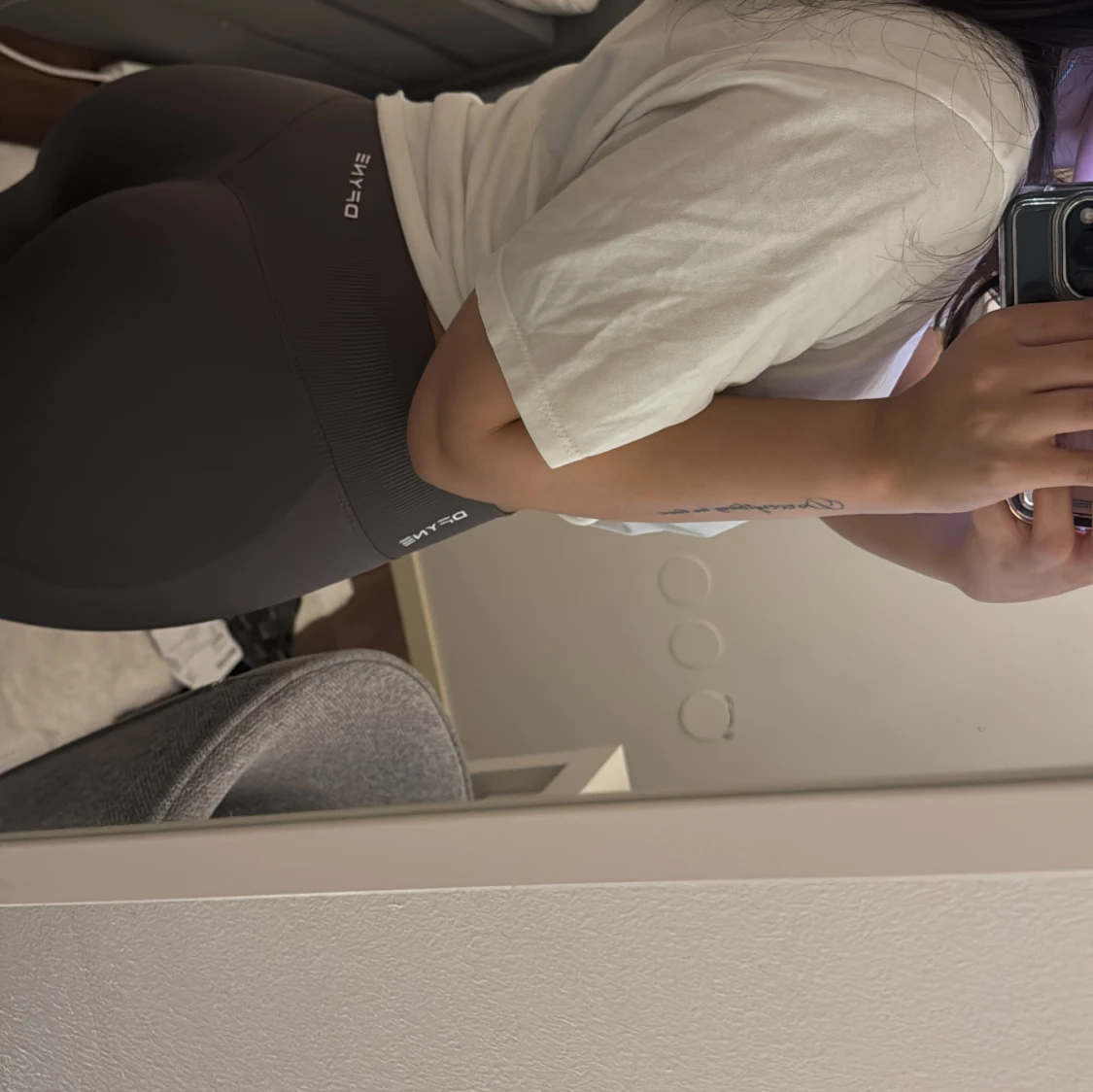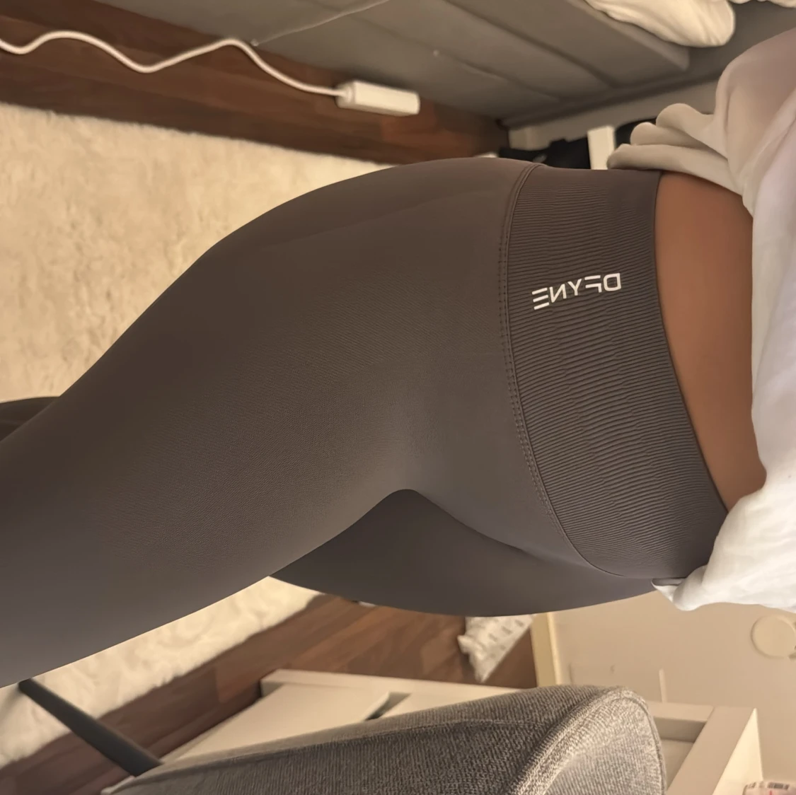 Snygga truffle leggings från DFYNE med medel midja och tight passform. Tillverkade i ett stretchigt syntetmaterial som sitter skönt och formar sig efter kroppen. Perfekta för träning eller chill dagar. Diskret logga på sidan av midjan. Impact leggings färgen truffle storlek Small. Litet märke på dem annars super bra