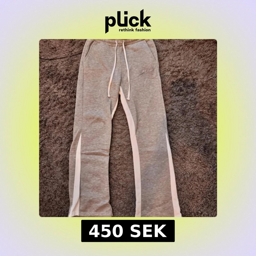 Snygga Flared grå mjukisbyxor längs benen och elastisk midja med snörning. Byxorna har fickor fram och en stor M-logga bak. Perfekta för chill eller träning, riktigt sköna och stilrena.