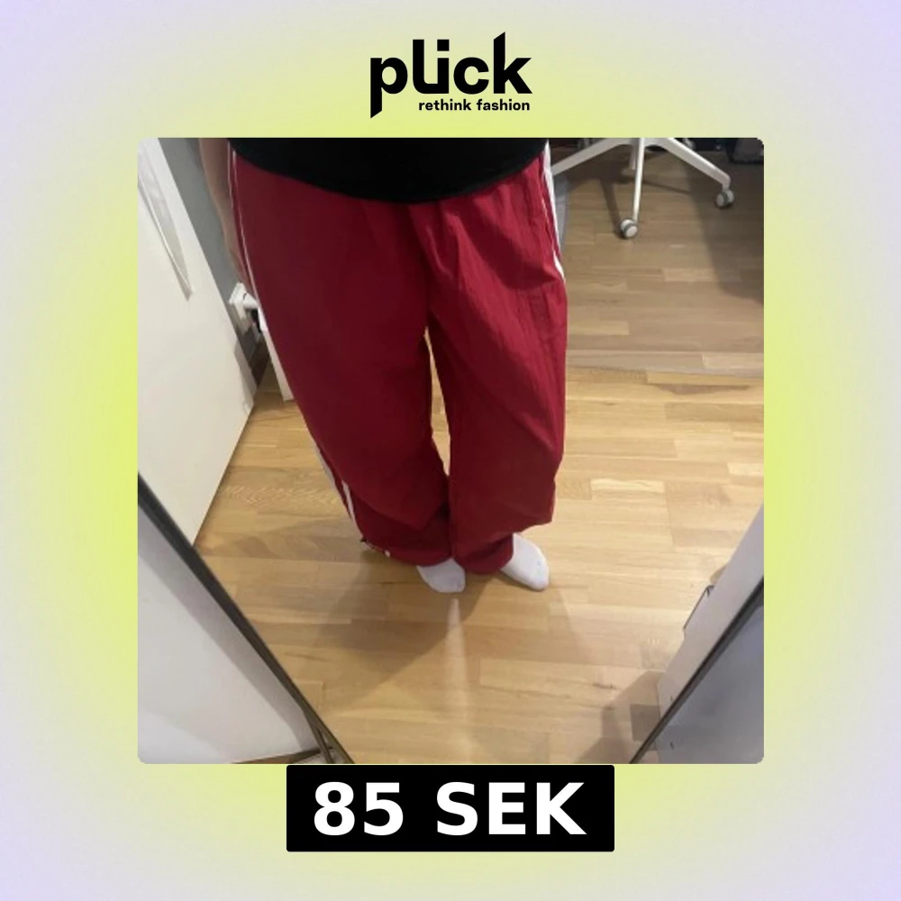 Säljer ett par röda träningsbyxor med vita ränder längs sidorna. Byxorna har resår i midjan och är i en loose passform. Materialet känns lätt och luftigt. Aldrig använt dem!