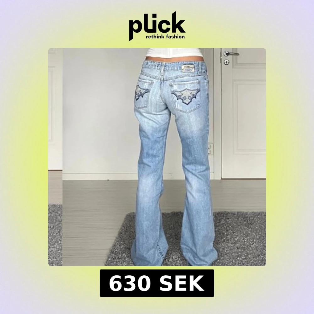 Säljer ett par ljusblå bootcut jeans med snygga broderade detaljer på bakfickorna. Jeansen har låg midja och klassisk femficksdesign. 💓