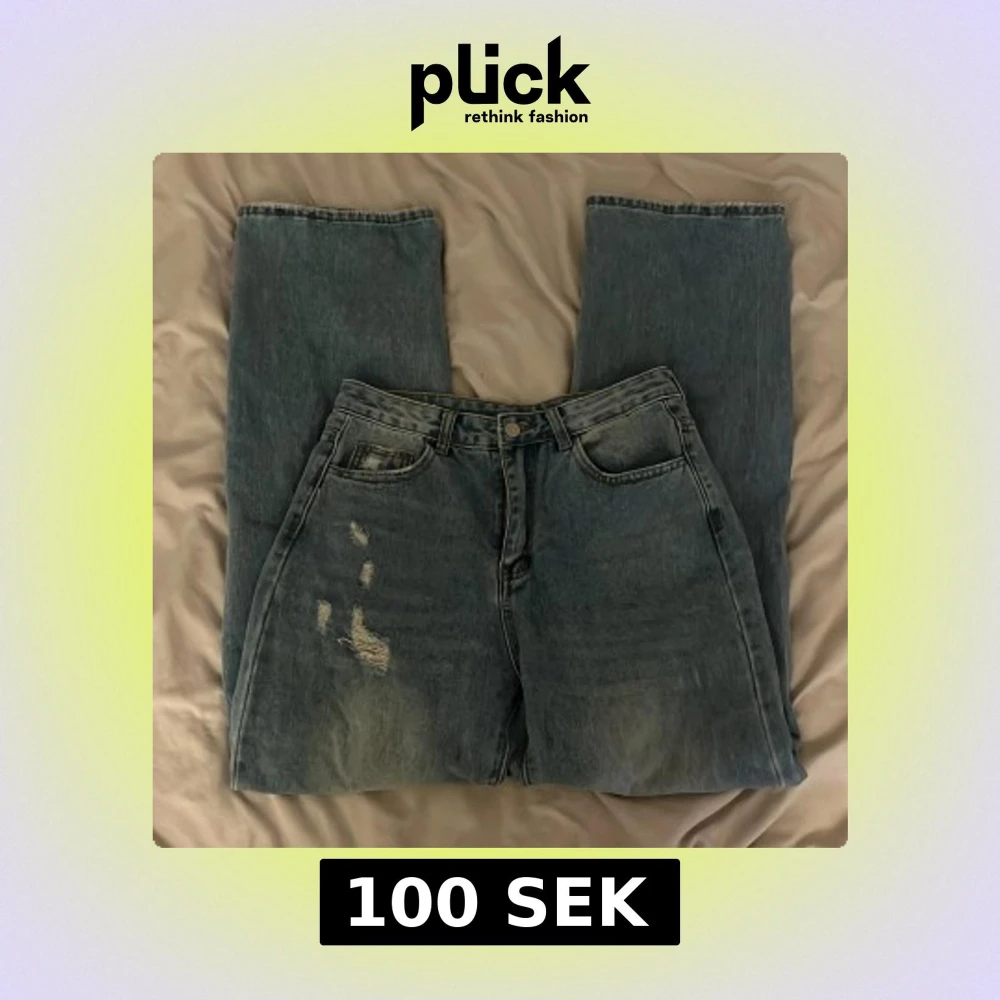 Säljer ett par blåa jeans med breda ben och coola slitningar framtill. Jeansen har hög midja.